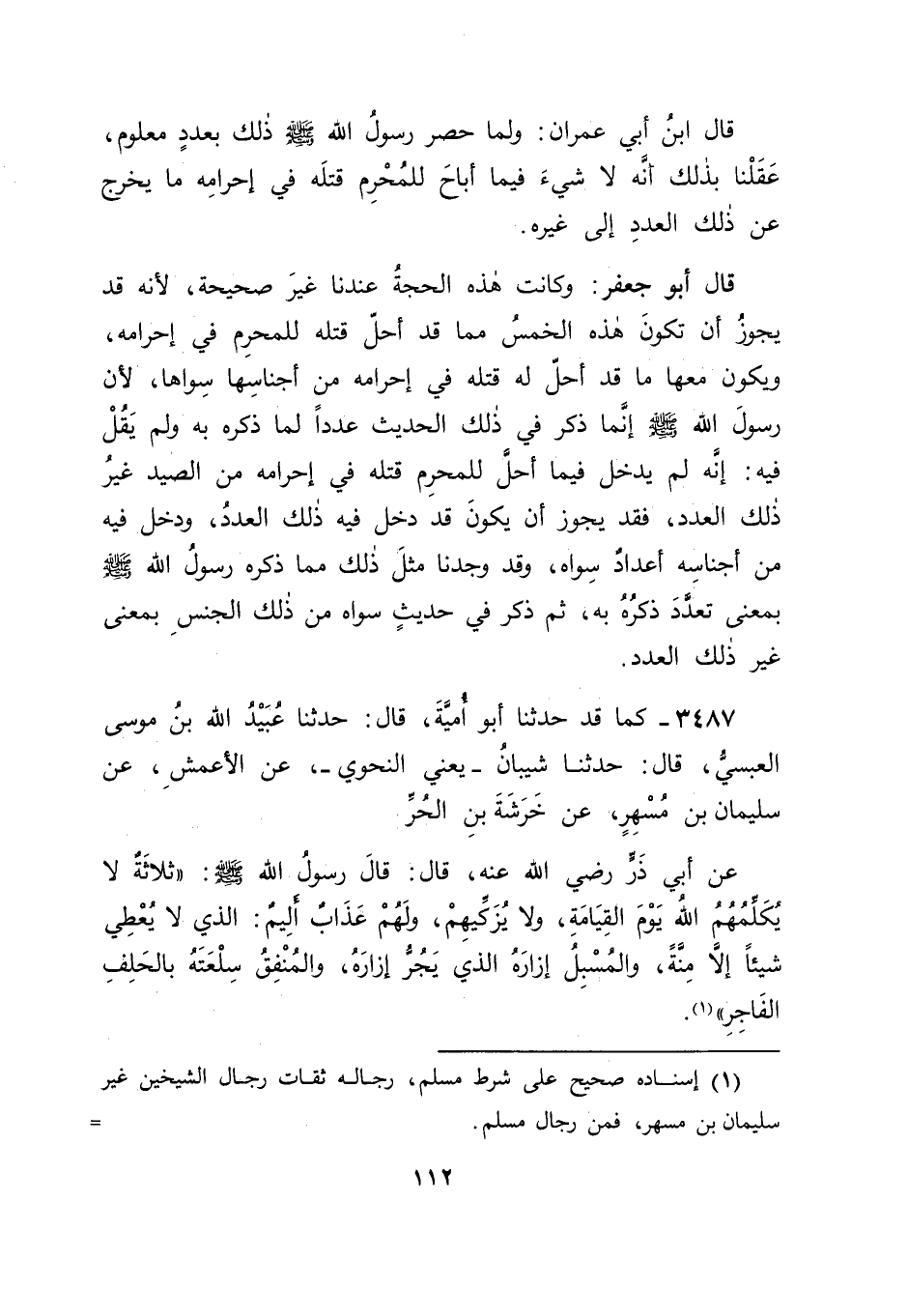 3487 - كَمَا قَدْ حَدَّثَنَا أَبُو أُمَيَّةَ قَالَ: حَدَّثَنَا عُبَيْدُ اللهِ بْنُ مُوسَى الْعَبْسِيُّ قَالَ: حَدَّثَنَا شَيْبَانُ - يَعْنِي: النَّحْوِيَّ عَنِ الْأَعْمَشِ , عَنْ سُلَيْمَانَ بْنِ مُسْهِرٍ , عَنْ خَرَشَةَ بْنِ الْحُرِّ , عَنْ أَبِي ذَرٍّ رَضِيَ اللهُ عَنْهُ قَالَ: قَالَ رَسُولُ اللهِ صَلَّى اللَّهُ عَلَيْهِ وَسَلَّمَ: " ثَلَاثَةٌ لَا يُكَلِّمُهُمُ اللهُ يَوْمَ الْقِيَامَةِ , وَلَا يُزَكِّيهِمْ , وَلَهُمْ عَذَابٌ أَلِيمٌ: الَّذِي لَا يُعْطِي شَيْئًا إِلَّا مِنَّةً , وَالْمُسْبِلُ إِزَارَهُ الَّذِي يَجُرُّ إِزَارَهُ , وَالْمُنْفِقُ سِلْعَتَهُ بِالْحَلِفِ الْفَاجِرِ " -[113]- قَالَ: فَذَكَرَ صَلَّى اللَّهُ عَلَيْهِ وَسَلَّمَ فِي هَذَا الْحَدِيثِ هَؤُلَاءِ الثَّلَاثَةَ بِمَا ذَكَرَهُمْ بِهِ فِيهِ ثُمَّ وَجَدْنَاهُ صَلَّى اللَّهُ عَلَيْهِ وَسَلَّمَ ذَكَرَ ثَلَاثَةً أُخَرَ بِذَلِكَ الْمَعْنَى فِي حَدِيثٍ آخَرَ.