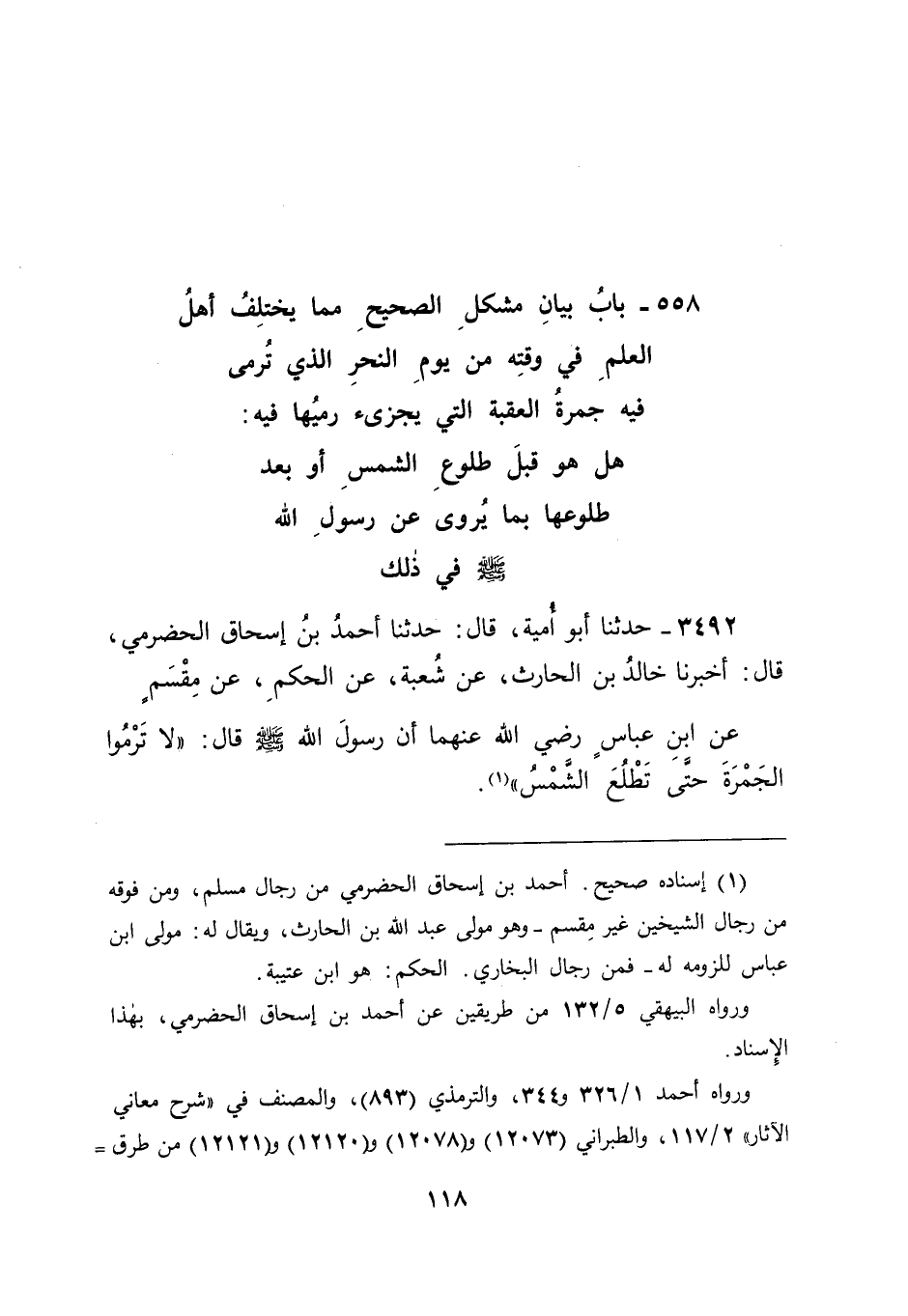 3492 - حَدَّثَنَا أَبُو أُمَيَّةَ قَالَ: حَدَّثَنَا أَحْمَدُ بْنُ إِسْحَاقَ الْحَضْرَمِيُّ قَالَ: حَدَّثَنَا خَالِدُ بْنُ الْحَارِثِ , عَنْ شُعْبَةَ , عَنِ الْحَكَمِ , عَنْ مِقْسَمٍ , عَنِ ابْنِ عَبَّاسٍ رَضِيَ اللهُ عَنْهُمَا أَنَّ رَسُولَ اللهِ صَلَّى اللَّهُ عَلَيْهِ وَسَلَّمَ قَالَ: " لَا تَرْمُوا الْجَمْرَةَ حَتَّى تَطْلُعَ الشَّمْسُ "