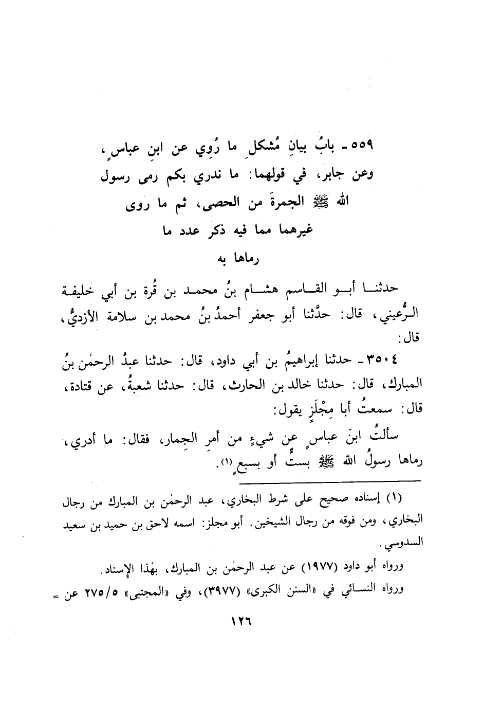 3504 - حَدَّثَنَا إِبْرَاهِيمُ بْنُ أَبِي دَاوُدَ قَالَ: حَدَّثَنَا عَبْدُ الرَّحْمَنِ بْنُ الْمُبَارَكِ قَالَ: حَدَّثَنَا خَالِدُ بْنُ الْحَارِثِ قَالَ: حَدَّثَنَا شُعْبَةُ , عَنْ قَتَادَةَ قَالَ: سَمِعْتُ أَبَا مِجْلَزٍ , يَقُولُ: سَأَلْتُ ابْنَ عَبَّاسٍ عَنْ شَيْءٍ مِنْ أَمْرِ الْجِمَارِ , فَقَالَ: " مَا أَدْرِي , رَمَاهَا رَسُولُ اللهِ صَلَّى اللَّهُ عَلَيْهِ وَسَلَّمَ بِسِتٍّ أَوْ بِسَبْعٍ "