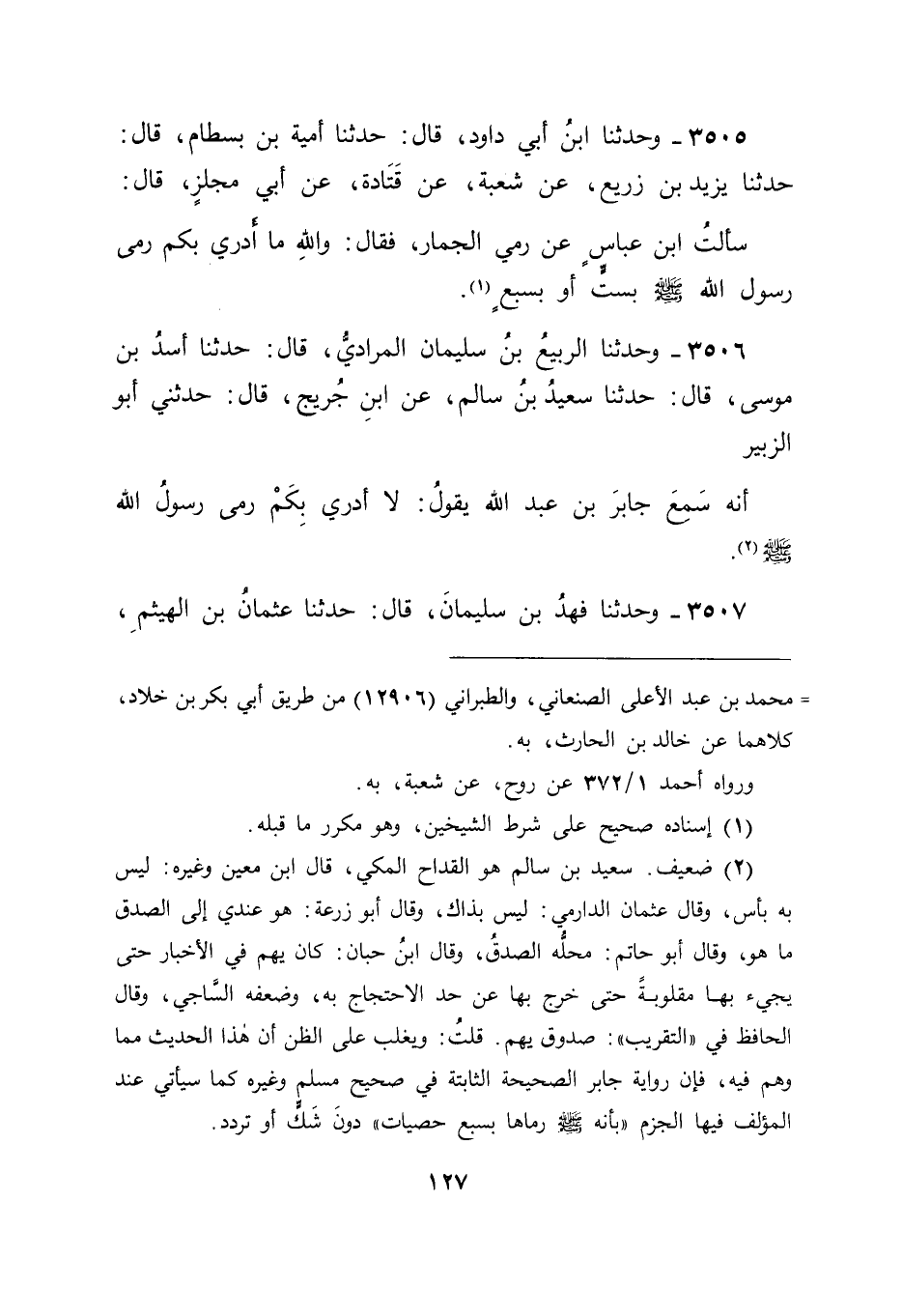 3507 - وَحَدَّثَنَا فَهْدُ بْنُ سُلَيْمَانَ قَالَ: حَدَّثَنَا عُثْمَانُ بْنُ الْهَيْثَمِ -[128]- قَالَ: حَدَّثَنَا ابْنُ جُرَيْجٍ قَالَ: أَخْبَرَنِي أَبُو الزُّبَيْرِ , أَنَّهُ سَمِعَ جَابِرًا يَقُولُ: " لَا أَدْرِي بِكَمْ رَمَى النَّبِيُّ صَلَّى اللَّهُ عَلَيْهِ وَسَلَّمَ " قَالَ أَبُو جَعْفَرٍ: فَتَأَمَّلْنَا حَدِيثَ ابْنِ عَبَّاسٍ فِي ذَلِكَ , وَهَلْ رُوِيَ فِي عَدَدِ الْحَصَى الَّتِي رَمَى بِهَا رَسُولُ اللهِ صَلَّى اللَّهُ عَلَيْهِ وَسَلَّمَ الْجَمْرَةَ عَدَدٌ مَعْلُومٌ؟