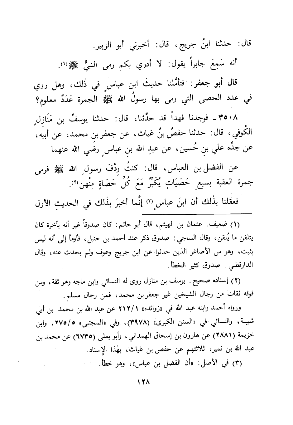 3508 - فَوَجَدْنَا فَهْدًا قَدْ حَدَّثَنَا قَالَ: حَدَّثَنَا يُوسُفُ بْنُ مَنَازِلٍ الْكُوفِيُّ قَالَ: حَدَّثَنَا حَفْصُ بْنُ غِيَاثٍ , عَنْ جَعْفَرِ بْنِ مُحَمَّدٍ , عَنْ أَبِيهِ , عَنْ جَدِّهِ عَلِيِّ بْنِ حُسَيْنٍ , عَنْ عَبْدِ اللهِ بْنِ عَبَّاسٍ رَضِيَ اللهُ عَنْهُمَا , عَنِ الْفَضْلِ بْنِ الْعَبَّاسِ قَالَ: " كُنْتُ رِدْفَ رَسُولِ اللهِ صَلَّى اللَّهُ عَلَيْهِ وَسَلَّمَ فَرَمَى جَمْرَةَ الْعَقَبَةِ بِسَبْعِ حَصَيَاتٍ , يُكَبِّرُ مَعَ كُلِّ حَصَاةٍ مِنْهُنَّ " فَعَقَلْنَا بِذَلِكَ أَنَّ ابْنَ عَبَّاسٍ , إِنَّمَا أَخْبَرَ بِذَلِكَ فِي الْحَدِيثِ الْأَوَّلِ -[129]- عَنْ دِرْيَةِ نَفْسِهِ , ثُمَّ أَخْبَرَ فِي الْحَدِيثِ الثَّانِي بِحَقِيقَةِ عَدَدِ مَا رَمَاهَا بِهِ رَسُولُ اللهِ صَلَّى اللَّهُ عَلَيْهِ وَسَلَّمَ , وَأَنَّهُ سَبْعُ حَصَيَاتٍ.