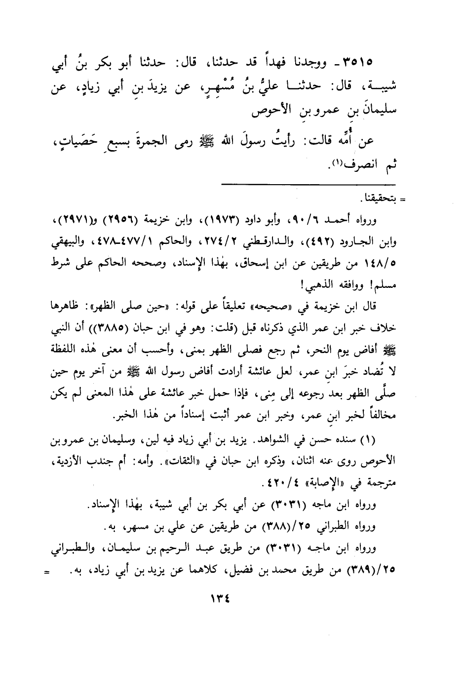 3515 - وَوَجَدْنَا فَهْدًا قَدْ حَدَّثَنَا قَالَ: حَدَّثَنَا أَبُو بَكْرِ بْنُ أَبِي شَيْبَةَ قَالَ: حَدَّثَنَا عَلِيُّ بْنُ مُسْهِرٍ , عَنْ يَزِيدَ بْنِ أَبِي زِيَادٍ , عَنْ سُلَيْمَانَ بْنِ عَمْرِو بْنِ الْأَحْوَصِ , عَنْ أُمِّهِ قَالَتْ: " رَأَيْتُ رَسُولَ اللهِ صَلَّى اللَّهُ عَلَيْهِ وَسَلَّمَ رَمَى الْجَمْرَةَ بِسَبْعِ حَصَيَاتٍ ثُمَّ انْصَرَفَ " -[135]- قَالَ أَبُو جَعْفَرٍ: فَكَانَ فِي هَذِهِ الْآثَارِ رَمْيُ رَسُولِ اللهِ صَلَّى اللَّهُ عَلَيْهِ وَسَلَّمَ كُلَّ جَمْرَةٍ مِنْ هَذِهِ الْجِمَارِ الثَّلَاثِ مِنَ الْحَصَى بِعَدَدٍ مَعْلُومٍ , كَمَا كَانَ مِنْهُ الطَّوَافُ بِالْبَيْتِ فِي حِجَّتِهِ أَشْوَاطًا مَعْلُومَةً , وَكَمَا كَانَ مِنْهُ السَّعْيُ بَيْنَ الصَّفَا وَالْمَرْوَةِ أَشْوَاطًا مَعْلُومَةً , وَقَالَ مَعَ ذَلِكَ: " لِتَأْخُذْ أُمَّتِي مَنَاسِكَهَا , فَإِنِّي لَا أَدْرِي لَعَلِّي أَنْ لَا أَلْقَاكُمْ بَعْدَ عَامِي هَذَا ".