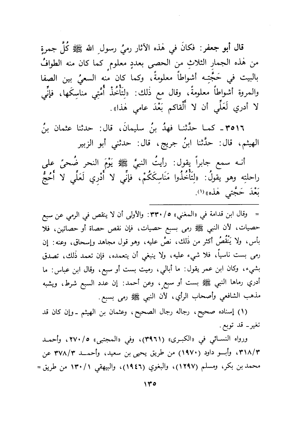 3516 - كَمَا حَدَّثَنَا فَهْدُ بْنُ سُلَيْمَانَ قَالَ: حَدَّثَنَا عُثْمَانُ بْنُ الْهَيْثَمِ قَالَ: حَدَّثَنَا ابْنُ جُرَيْجٍ قَالَ: حَدَّثَنِي أَبُو الزُّبَيْرِ , أَنَّهُ سَمِعَ جَابِرًا يَقُولُ: رَأَيْتُ النَّبِيَّ صَلَّى اللَّهُ عَلَيْهِ وَسَلَّمَ يَوْمَ النَّحْرِ ضُحًى عَلَى رَاحِلَتِهِ وَهُوَ يَقُولُ: " لِتَأْخُذُوا مَنَاسِكَكُمْ , فَإِنِّي لَا أَدْرِي لَعَلِّي لَا أَحُجُّ بَعْدَ حَجَّتِي هَذِهِ " -[136]- وَكَانَ ذَلِكَ مِنْهُ صَلَّى اللَّهُ عَلَيْهِ وَسَلَّمَ لِيَتَّبِعُوا آثَارَهُ , وَيَكُونُوا فِيمَا يَفْعَلُونَهُ فِي حَجِّهِمْ مُتَّبِعِينَ مُمْتَثِلِينَ لِأَفْعَالِهِ , غَيْرَ خَارِجِينَ عَنْهَا إِلَى زِيَادَةٍ عَلَيْهَا , وَلَا إِلَى نُقْصَانٍ عَنْهَا , وَكَمَا كَانَتِ الْأَشْوَاطُ الَّتِي ذَكَرْنَاهَا لَا يَصْلُحُ التَّجَاوُزُ لَهَا , وَلَا التَّقْصِيرُ عَنْهَا فِي عَدَدِهَا , كَانَ مِثْلُ ذَلِكَ الْحَصَى الَّتِي يُرْمَى بِهَا الْجِمَارُ فِي الْحَجِّ فِي عَدَدِهَا لَا يَصْلُحُ التَّجَاوُزُ لِعَدِّهَا الَّذِي رَمَاهَا بِهِ , وَلَا التَّقْصِيرُ عَنْهُ إِلَى مَا هُوَ دُونَهُ , وَاللهَ عَزَّ وَجَلَّ نَسْأَلُهُ التَّوْفِيقَ.