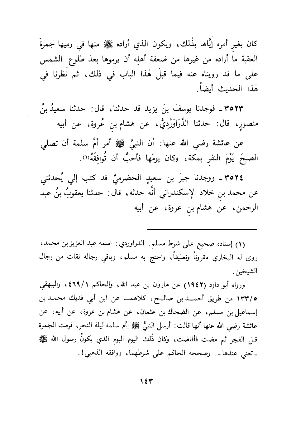 3523 - فَوَجَدْنَا يُوسُفَ بْنَ يَزِيدَ قَدْ حَدَّثَنَا قَالَ: حَدَّثَنَا سَعِيدُ بْنُ مَنْصُورٍ قَالَ: حَدَّثَنَا الدَّرَاوَرْدِيُّ , عَنْ هِشَامِ بْنِ عُرْوَةَ , عَنْ أَبِيهِ , عَنْ عَائِشَةَ رَضِيَ اللهُ عَنْهَا: " أَنَّ النَّبِيَّ صَلَّى اللَّهُ عَلَيْهِ وَسَلَّمَ أَمَرَ أُمَّ سَلَمَةَ أَنْ تُصَلِّيَ الصُّبْحَ يَوْمَ النَّفْرِ بِمَكَّةَ , وَكَانَ يَوْمَهَا , فَأَحَبَّ أَنْ تُوَافِقَهُ "