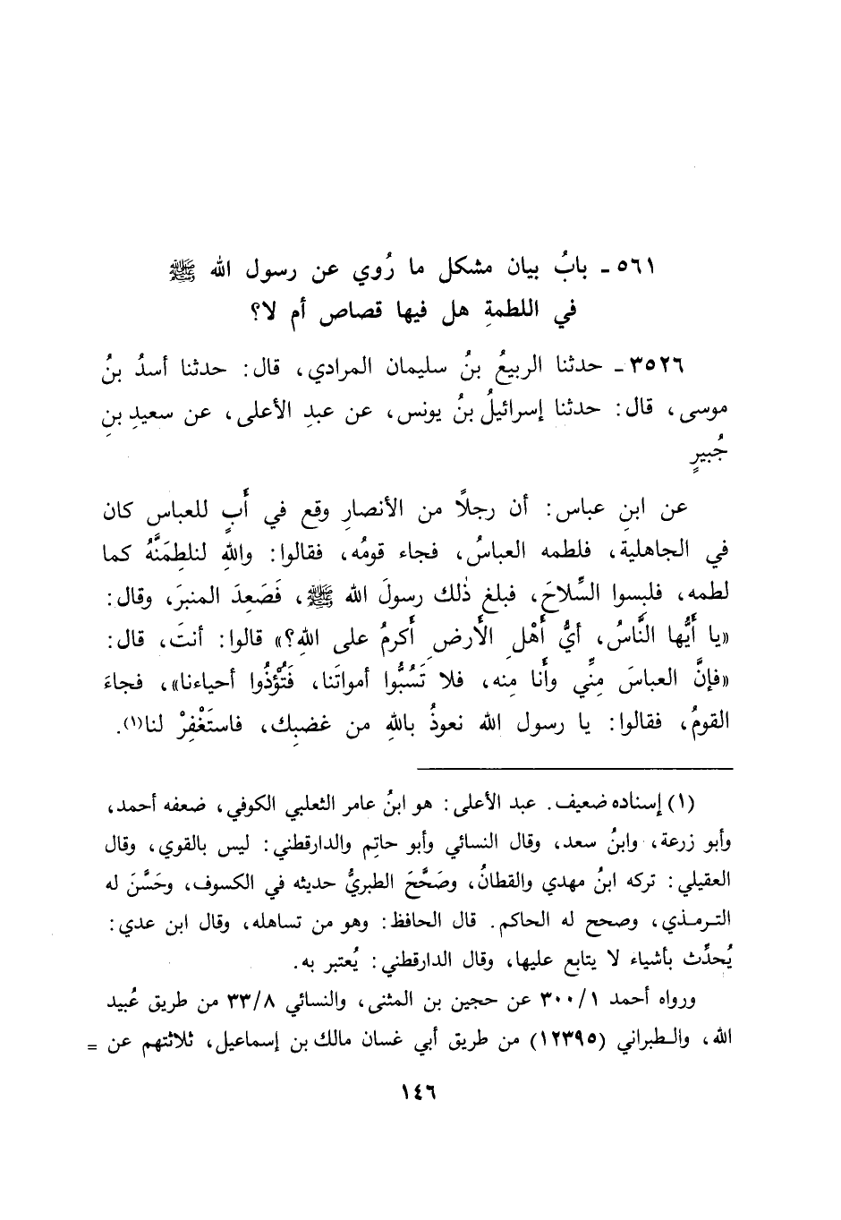 3526 - حَدَّثَنَا الرَّبِيعُ بْنُ سُلَيْمَانَ الْمُرَادِيُّ قَالَ: حَدَّثَنَا أَسَدُ بْنُ مُوسَى قَالَ: حَدَّثَنَا إِسْرَائِيلُ بْنُ يُونُسَ , عَنْ عَبْدِ الْأَعْلَى , عَنْ سَعِيدِ بْنِ جُبَيْرٍ , عَنِ ابْنِ عَبَّاسٍ: " أَنَّ رَجُلًا مِنَ الْأَنْصَارِ وَقَعَ فِي أَبٍ لِلْعَبَّاسِ كَانَ فِي الْجَاهِلِيَّةِ , فَلَطَمَهُ الْعَبَّاسُ , فَجَاءَ قَوْمَهُ فَقَالُوا: وَاللهِ لَنَلْطِمَنَّهُ كَمَا لَطَمَهُ. فَلَبِسُوا السِّلَاحَ , فَبَلَغَ ذَلِكَ رَسُولَ اللهِ صَلَّى اللَّهُ عَلَيْهِ وَسَلَّمَ , فَصَعِدَ الْمِنْبَرَ وَقَالَ: " يَا أَيُّهَا النَّاسُ , أَيُّ أَهْلِ الْأَرْضِ أَكْرَمُ عَلَى اللهِ؟ " , قَالُوا: أَنْتَ , قَالَ: " فَإِنَّ الْعَبَّاسَ مِنِّي وَأَنَا مِنْهُ , فَلَا تَسُبُّوا أَمْوَاتَنَا , فَتُؤْذُوا أَحْيَاءَنَا " , فَجَاءَ الْقَوْمُ فَقَالُوا: يَا رَسُولَ اللهِ , نَعُوذُ بِاللهِ مِنْ غَضَبِكَ , فَاسْتَغْفِرْ لَنَا " -[147]- فَقَالَ قَائِلٌ: فَفِي هَذَا الْحَدِيثِ أَنَّ قَوْمَ الْمَلْطُومِ طَلَبُوا الْقِصَاصَ مِنَ اللَّطْمَةِ الَّتِي كَانَتْ مِنَ الْعَبَّاسِ إِلَى صَاحِبِهِمْ , وَلَمْ يُنْكِرْ ذَلِكَ رَسُولُ اللهِ صَلَّى اللَّهُ عَلَيْهِ وَسَلَّمَ عَلَيْهِمْ , فَفِي ذَلِكَ مَا قَدْ دَلَّ عَلَى وُجُوبِ الْقِصَاصِ فِي اللَّطْمَةِ , وَأَنْتُمْ لَا تَقُولُونَ ذَلِكَ فِي جُمْلَتِكُمْ , وَلَا أَهْلُ الْمَدِينَةِ سِوَاكُمْ.
