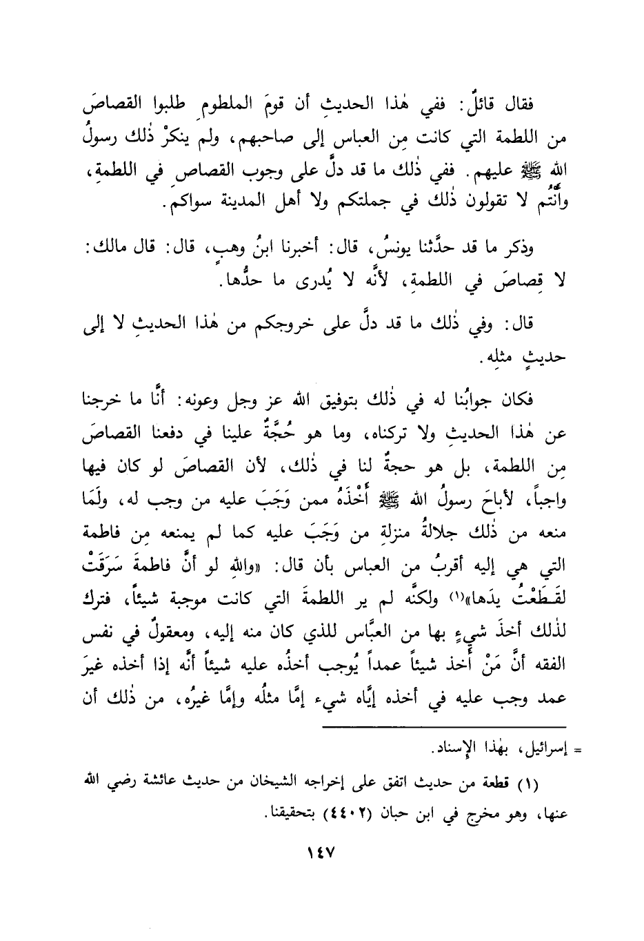 وَذَكَرَ مَا قَدْ حَدَّثَنَا يُونُسُ قَالَ: أَخْبَرَنَا ابْنُ وَهْبٍ قَالَ: قَالَ مَالِكٌ: " لَا قِصَاصَ فِي اللَّطْمَةِ؛ لِأَنَّهُ لَا يُدْرَى مَا حَدُّهَا " قَالَ: وَفِي ذَلِكَ مَا قَدْ دَلَّ عَلَى خُرُوجِكُمْ مِنْ هَذَا الْحَدِيثِ , لَا إِلَى حَدِيثٍ مِثْلِهِ. فَكَانَ جَوَابُنَا لَهُ فِي ذَلِكَ بِتَوْفِيقِ اللهِ عَزَّ وَجَلَّ وَعَوْنِهِ: إِنَّا مَا خَرَجْنَا عَنْ هَذَا الْحَدِيثِ وَلَا تَرَكْنَاهُ , وَمَا هُوَ حُجَّةٌ عَلَيْنَا فِي دَفْعِنَا الْقِصَاصَ مِنَ اللَّطْمَةِ , بَلْ هُوَ حُجَّةٌ لَنَا فِي ذَلِكَ؛ لِأَنَّ الْقِصَاصَ لَوْ كَانَ فِيهَا وَاجِبًا لَأَبَاحَ رَسُولُ اللهِ صَلَّى اللَّهُ عَلَيْهِ وَسَلَّمَ أَخْذَهُ مِمَّنْ وَجَبَ عَلَيْهِ لِمَنْ وَجَبَ لَهُ , وَلَمَا مَنَعَهُ مِنْ ذَلِكَ جَلَالَةُ مَنْزِلَةِ مَنْ وَجَبَ عَلَيْهِ , كَمَا لَمْ يَمْنَعْهُ مِنْ فَاطِمَةَ الَّتِي هِيَ إِلَيْهِ أَقْرَبُ مِنَ الْعَبَّاسِ بِأَنْ قَالَ: " وَاللهِ لَوْ أَنَّ فَاطِمَةَ سَرَقَتْ لَقَطَعْتُ يَدَهَا " , وَلَكِنَّهُ لَمْ يَرَ اللَّطْمَةَ الَّتِي كَانَتْ مُوجِبَةً شَيْئًا , فَتَرَكَ لِذَلِكَ أَخْذَ شَيْءٍ بِهَا مِنَ الْعَبَّاسِ لِلَّذِي كَانَ مِنْهُ إِلَيْهِ , وَمَعْقُولٌ فِي نَفْسِ الْفِقْهِ أَنَّ مَنْ أَخَذَ شَيْئًا عَمْدًا يُوجِبُ أَخْذُهُ عَلَيْهِ شَيْئًا , أَنَّهُ إِذَا أَخَذَهُ غَيْرَ عَمْدٍ , وَجَبَ عَلَيْهِ فِي أَخْذِهِ إِيَّاهُ شَيْءٌ , إِمَّا مِثْلُهُ , وَإِمَّا غَيْرُهُ , مِنْ ذَلِكَ أَنَّ -[148]- رَجُلًا لَوِ اسْتَهْلَكَ لِرَجُلٍ مَالًا عَلَى خَطَأٍ كَانَ مِنْهُ أَنَّ عَلَيْهِ لَهُ مِثْلَهُ إِنْ كَانَ لَهُ مِثْلٌ , أَوْ قِيمَتَهُ إِنْ كَانَ لَا مِثْلَ لَهُ , وَأَنَّهُ لَوْ قَتَلَهُ عَمْدًا لَوَجَبَ عَلَيْهِ الْقِصَاصُ , وَلَوْ قَتَلَهُ خَطَأً وَجَبَتْ عَلَيْهِ الدِّيَةُ , فَكَانَ مِثْلَ ذَلِكَ مَا ذَكَرْنَا مِنَ اللَّطْمَةِ الَّتِي لَمْ تَجْرَحْ , وَلَمْ تُؤَثِّرْ فِي وَجْهِ الْمَلْطُومِ أَثَرًا , لَا شَيْءَ فِيهَا إِذَا كَانَ ذَلِكَ خَطَأً , فَمِثْلُ ذَلِكَ إِذَا كَانَتْ عَمْدًا لَا شَيْءَ فِيهَا , وَلِهَذَا الْمَعْنَى , وَاللهُ أَعْلَمُ , تَرَكَ رَسُولُ اللهِ صَلَّى اللَّهُ عَلَيْهِ وَسَلَّمَ أَنْ يَأْخُذَ لِلَّذِي لَطَمَهُ الْعَبَّاسُ مِنَ الْعَبَّاسِ لِلَطْمَتِهِ إِيَّاهُ شَيْئًا مِنْ قَوَدٍ , وَمِنْ غَيْرِهِ. فَقَالَ: فَقَدْ رُوِّيتُمْ عَنْ رَسُولِ اللهِ صَلَّى اللَّهُ عَلَيْهِ وَسَلَّمَ.