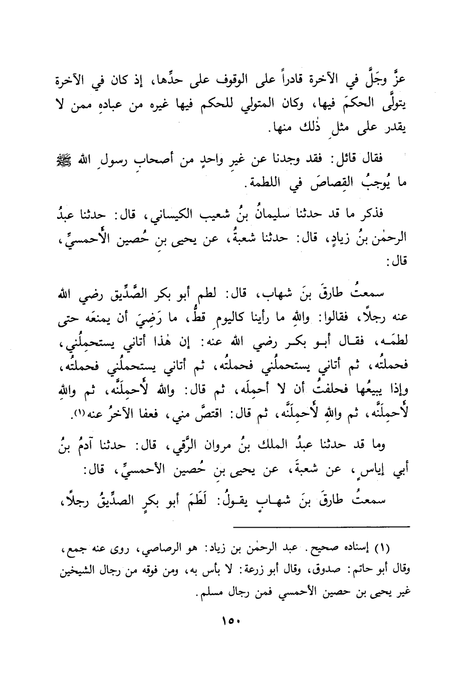 وَمَا قَدْ حَدَّثَنَا عَبْدُ الْمَلِكِ بْنُ مَرْوَانَ الرَّقِّيُّ قَالَ: حَدَّثَنَا آدَمُ بْنُ أَبِي إِيَاسَ , عَنْ شُعْبَةَ , عَنْ يَحْيَى بْنِ حُصَيْنٍ الْأَحْمَسِيِّ قَالَ: سَمِعْتُ طَارِقَ بْنَ شِهَابٍ يَقُولُ: " لَطَمَ أَبُو بَكْرٍ الصِّدِّيقُ رَجُلًا , -[151]- فَقَالُوا: مَا رَضِيَ أَنْ يَمْنَعَهُ حَتَّى لَطَمَهُ , فَقَالَ أَبُو بَكْرٍ رَضِيَ اللهُ عَنْهُ لِلرَّجُلِ: " اقْتَصَّ مِنِّي " , فَعَفَا عَنْهُ الرَّجُلُ فَكَانَ جَوَابُنَا فِي ذَلِكَ بِتَوْفِيقِ اللهِ عَزَّ وَجَلَّ وَعَوْنِهِ: أَنَّهُ يَحْتَمِلُ أَنْ يَكُونَ أَبُو بَكْرٍ أَبَاحَ ذَلِكَ مِنْ نَفْسِهِ , لَا بِوَاجِبٍ عَلَيْهِ , وَلَكِنْ تَوَاضُعٍ مِنْهُ , وَكَرَاهَةٍ لِمَا كَانَ مِنْهُ مِنَ الِاسْتِعْلَاءِ عَلَى غَيْرِهِ بِلَطْمِهِ إِيَّاهُ.