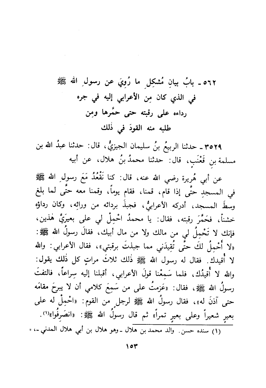 3529 - حَدَّثَنَا الرَّبِيعُ بْنُ سُلَيْمَانَ الْجِيزِيُّ قَالَ: حَدَّثَنَا عَبْدُ اللهِ بْنُ مَسْلَمَةَ بْنِ قَعْنَبٍ قَالَ: حَدَّثَنَا مُحَمَّدُ بْنُ هِلَالٍ , عَنْ أَبِيهِ , عَنْ أَبِي هُرَيْرَةَ رَضِيَ اللهُ عَنْهُ قَالَ: " كُنَّا نَقْعُدُ مَعَ رَسُولِ اللهِ صَلَّى اللَّهُ عَلَيْهِ وَسَلَّمَ فِي الْمَسْجِدِ حَتَّى إِذَا قَامَ قُمْنَا , فَقَامَ يَوْمًا وَقُمْنَا مَعَهُ , حَتَّى لَمَّا بَلَغَ وَسَطَ الْمَسْجِدِ أَدْرَكَهُ الْأَعْرَابِيُّ , فَجَبَذَ بِرِدَائِهِ مِنْ وَرَائِهِ , وَكَانَ رِدَاؤُهُ خَشِنًا , فَحَمَّرَ رَقَبَتَهُ , فَقَالَ: يَا مُحَمَّدُ احْمِلْ لِي عَلَى بَعِيرَيَّ هَذَيْنِ , فَإِنَّكَ لَا تَحْمِلُ لِي مِنْ مَالِكَ , وَلَا مِنْ مَالِ أَبِيكَ , فَقَالَ رَسُولُ اللهِ صَلَّى اللَّهُ عَلَيْهِ وَسَلَّمَ: " لَا أَحْمِلُ لَكَ حَتَّى تُقِيدَنِي مِمَّا جَبَذْتَ بِرَقَبَتِي " , فَقَالَ الْأَعْرَابِيُّ: وَاللهِ لَا أُقِيدُكَ , فَقَالَ لَهُ رَسُولُ اللهِ صَلَّى اللَّهُ عَلَيْهِ وَسَلَّمَ ذَلِكَ ثَلَاثَ مَرَّاتٍ , كُلَّ ذَلِكَ يَقُولُ: وَاللهِ لَا أُقِيدُكَ , فَلَمَّا سَمِعْنَا قَوْلَ الْأَعْرَابِيِّ , أَقْبَلْنَا إِلَيْهِ سِرَاعًا , فَالْتَفَتَ رَسُولُ اللهِ صَلَّى اللَّهُ عَلَيْهِ وَسَلَّمَ فَقَالَ: " عَزَمْتُ عَلَى مَنْ سَمِعَ كَلَامِي أَنْ لَا يَبْرَحَ مَقَامَهُ حَتَّى آذَنَ لَهُ ". فَقَالَ رَسُولُ اللهِ صَلَّى اللَّهُ عَلَيْهِ وَسَلَّمَ لِرَجُلٍ مِنَ الْقَوْمِ: " احْمِلْ لَهُ عَلَى بَعِيرٍ شَعِيرًا , وَعَلَى بَعِيرٍ تَمْرًا " , ثُمَّ قَالَ رَسُولُ اللهِ صَلَّى اللَّهُ عَلَيْهِ وَسَلَّمَ: " انْصَرِفُوا " -[154]- قَالَ أَبُو جَعْفَرٍ: فَقَالَ قَائِلٌ: مِنْ أَيْنَ وَسِعَكُمُ الْقَوَدُ فِي مِثْلِ مَا ذُكِرَ فِي هَذَا الْحَدِيثِ حَتَّى خَالَفْتُمُوهُ جَمِيعًا , لَا إِلَى حَدِيثٍ مِثْلِهِ؟ فَكَانَ جَوَابُنَا لَهُ فِي ذَلِكَ بِتَوْفِيقِ اللهِ عَزَّ وَجَلَّ وَعَوْنِهِ , أَنَّهُ قَدْ يَحْتَمِلُ أَنْ يَكُونَ الْقَوَدُ الَّذِي طَلَبَهُ رَسُولُ اللهِ صَلَّى اللَّهُ عَلَيْهِ وَسَلَّمَ مِنْ ذَلِكَ الْأَعْرَابِيِّ لَمْ يَكُنْ عَلَى مَا تَوَهَّمَهُ مِنَ الْقِصَاصِ , وَلَكِنَّهُ كَانَ عَلَى أَنْ يَعُودَ مُتَوَاضِعًا بِالْبَذْلِ لَهُ مِنْ نَفْسِهِ مِثْلَ الَّذِي فَعَلَهُ , حَتَّى يَكُونَ بِذَلِكَ عَلَى مِثْلِ مَا يَكُونُ عَلَيْهِ أَهْلُ الْإِسْلَامِ فِي التَّوَاضُعِ عِنْدَ مِثْلِ هَذَا , كَمَا كَانَ مِنْ تَوَاضُعِ رَسُولِ اللهِ صَلَّى اللَّهُ عَلَيْهِ وَسَلَّمَ فِي حَدِيثِ عُمَرَ الَّذِي ذَكَرْنَا , ثُمَّ مِنْ تَوَاضُعِ أَبِي بَكْرٍ رَضِيَ اللهُ عَنْهُ الَّذِي رُوِّينَا فِي الْبَابِ الَّذِي قَبْلَ هَذَا الْبَابِ , وَيَكُونُ ذِكْرُهُ الْقَوَدَ عَلَى الِاسْتِعَارَةِ , كَمَا تَسْتَعِيرُ الْعَرَبُ الْكَلِمَةَ لِلْمَعْنَى الَّذِي فِيهَا مِمَّا اسْتَعَارُوهَا مِنْهُ , مِنْ ذَلِكَ قَوْلُهُمْ: هُرَاقَ فُلَانٌ مُهْجَةَ فُلَانٍ , لَيْسَ لِأَنَّ الْمُهْجَةَ مُهْرَاقَةٌ , وَإِنَّمَا الْمُهْرَاقُ الدَّمُ , وَهُوَ مَا وَصَفَ اللهُ عَزَّ وَجَلَّ فِي قِصَّةِ مُوسَى وَصَاحِبِهِ صَلَوَاتُ اللهِ عَلَيْهِمَا مِنْ قَوْلِهِ: {فَوَجَدَا فِيهَا جِدَارًا يُرِيدُ أَنْ يَنْقَضَّ فَأَقَامَهُ} [الكهف: 77] , فَذَكَرَهُ بِالْإِرَادَةِ , وَالْجِدَارُ لَا إِرَادَةَ -[155]- لَهُ , وَلَكِنَّهُ كَانَ مِنْهُ مَا يَكُونُ مِنْ ذَوِي الْإِرَادَةِ عِنْدَ إِرَادَتِهِمْ إِلْقَاءَ أَنْفُسِهِمْ إِلَى الْأَرْضِ , فَمِثْلُ ذَلِكَ مَا أَرَادَ مِنَ الْأَعْرَابِيِّ أَنْ يَبْذُلَ لَهُ مِنْ نَفْسِهِ مِثْلَ الَّذِي يُبْذَلُ بِالْقَوَدِ , وَفِيمَا ذَكَرْنَا مَا قَدْ دَلَّ عَلَى أَنْ لَا حُجَّةَ لِهَذَا الْمُتَأَوِّلِ عَلَيْنَا فِيمَا احْتَجَّ بِهِ عَلَيْنَا مِنْ تَأْو