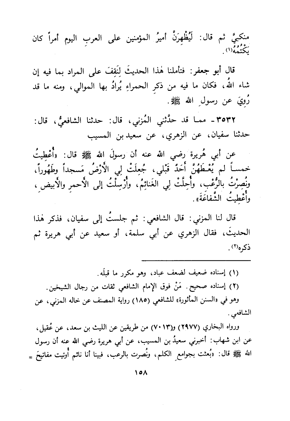3532 - مِمَّا قَدْ حَدَّثَنِي الْمُزَنِيُّ قَالَ: حَدَّثَنَا الشَّافِعِيُّ قَالَ: حَدَّثَنَا سُفْيَانُ , عَنِ الزُّهْرِيِّ , عَنْ سَعِيدِ بْنِ الْمُسَيِّبِ , عَنْ أَبِي هُرَيْرَةَ رَضِيَ اللهُ عَنْهُ , أَنَّ رَسُولَ اللهِ صَلَّى اللَّهُ عَلَيْهِ وَسَلَّمَ قَالَ: " أُعْطِيتُ خَمْسًا لَمْ يُعْطَهُنَّ أَحَدٌ قَبْلِي: جُعِلَتْ لِيَ الْأَرْضُ مَسْجِدًا وَطَهُورًا , وَنُصِرْتُ بِالرُّعْبِ , وَأُحِلَّتْ لِيَ الْغَنَائِمُ , وَأُرْسِلْتُ إِلَى الْأَحْمَرِ وَالْأَبْيَضِ , وَأُعْطِيتُ الشَّفَاعَةَ " قَالَ لَنَا الْمُزَنِيُّ: قَالَ الشَّافِعِيُّ: ثُمَّ جَلَسْتُ إِلَى سُفْيَانَ , فَذَكَرَ هَذَا الْحَدِيثَ , فَقَالَ الزُّهْرِيُّ , عَنْ أَبِي سَلَمَةَ أَوْ سَعِيدٍ , عَنْ أَبِي هُرَيْرَةَ , ثُمَّ ذَكَرَهُ. -[161]- وَكَانَ فِيهِ مِنَ الضَّيَاطِرَةِ الْمَذْكُورِينَ فِيهِ أَنَّهُ يُرَادُ بِهِمُ الَّذِينَ يَحْضُرُونَ الْأَسْوَاقَ بِلَا مَالٍ مَعَهُمْ , يُحْضَرُ بِهِ الْأَسْوَاقُ , وَيُنْتَفَعُ بِهِ فِي حُضُورِهَا , وَكَانَ مَنْ يَحْضُرُهَا كَذَلِكَ كَمَنْ لَمْ يَحْضُرْهَا , فَمِثْلُهُ مَنْ يَحْضُرُ غَيْرَهَا بِلَا مَنْفَعَةٍ فِي حُضُورِهِ لِمَا يُحْضِرُهُ , وَالْوَاحِدُ مِنَ الضَّيَاطِرَةِ ضَيْطَارٌ. ثُمَّ تَأَمَّلْنَا مَا فِي هَذَا الْحَدِيثِ مِنْ قَوْلِ رَسُولِ اللهِ صَلَّى اللَّهُ عَلَيْهِ وَسَلَّمَ الَّذِي ذَكَرْنَاهُ فِيهِ عَنْهُ , فَكَانَ الْعَرَبُ بَدْءًا هُمُ الَّذِينَ قَاتَلُوا الْعَجَمَ حَتَّى أَدْخَلُوهُمْ فِي الْإِسْلَامِ , كَمَا قَدْ رُوِيَ عَنْ رَسُولِ اللهِ صَلَّى اللَّهُ عَلَيْهِ وَسَلَّمَ فِي ذَلِكَ