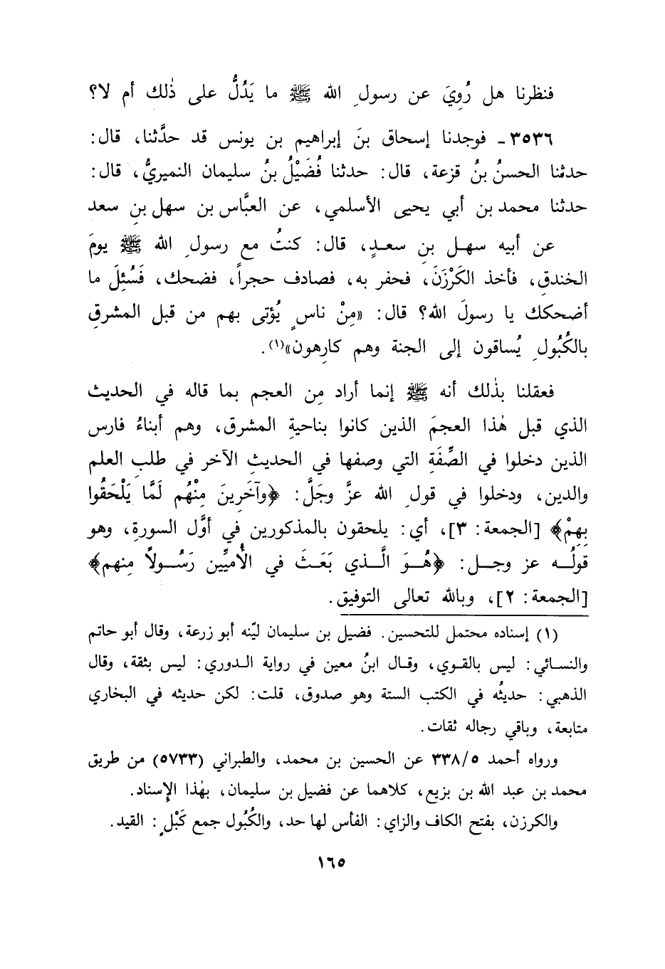 3536 - فَوَجَدْنَا إِسْحَاقَ بْنَ إِبْرَاهِيمَ بْنِ يُونُسَ قَدْ حَدَّثَنَا قَالَ: حَدَّثَنَا الْحَسَنُ بْنُ قَزَعَةَ قَالَ: حَدَّثَنَا فُضَيْلُ بْنُ سُلَيْمَانَ النُّمَيْرِيُّ قَالَ: حَدَّثَنَا مُحَمَّدُ بْنُ أَبِي يَحْيَى الْأَسْلَمِيُّ , عَنِ الْعَبَّاسِ بْنِ سَهْلِ بْنِ سَعْدٍ , عَنْ أَبِيهِ سَهْلِ بْنِ سَعْدٍ قَالَ: كُنْتُ مَعَ رَسُولِ اللهِ صَلَّى اللَّهُ عَلَيْهِ وَسَلَّمَ يَوْمَ الْخَنْدَقِ , فَأَخَذَ الْكَرْزَنَ فَحَفَرَ بِهِ , فَصَادَفَ حَجَرًا فَضَحِكَ , فَسُئِلَ: مَا أَضْحَكَكَ يَا رَسُولَ اللهِ؟ قَالَ: " مِنْ نَاسٍ يُؤْتَى بِهِمْ مِنْ قِبَلِ الْمَشْرِقِ بِالْكُبُولِ يُسَاقُونَ إِلَى الْجَنَّةِ وَهُمْ كَارِهُونَ " فَعَقَلْنَا بِذَلِكَ أَنَّهُ صَلَّى اللَّهُ عَلَيْهِ وَسَلَّمَ إِنَّمَا أَرَادَ مِنَ الْعَجَمِ , بِمَا قَالَهُ فِي الْحَدِيثِ الَّذِي قَبْلَ هَذَا , الْعَجَمَ الَّذِينَ كَانُوا بِنَاحِيَةِ الْمَشْرِقِ , وَهُمْ أَبْنَاءُ فَارِسَ الَّذِينَ دَخَلُوا فِي الصِّفَةِ الَّتِي وَصَفَهَا فِي الْحَدِيثِ الْآخَرِ فِي طَلَبِ الْعِلْمِ وَالدِّينِ , وَدَخَلُوا فِي قَوْلِ اللهِ عَزَّ وَجَلَّ: {وَآخَرِينَ مِنْهُمْ لَمَّا يَلْحَقُوا بِهِمْ} [الجمعة: 3] ؛ أَيْ: يَلْحَقُونَ بِالْمَذْكُورِينَ فِي أَوَّلِ السُّورَةِ , وَهُوَ قَوْلُهُ عَزَّ وَجَلَّ: {هُوَ الَّذِي بَعَثَ فِي الْأُمِّيِّينَ رَسُولًا مِنْهُمْ} [الجمعة: 2] , وَبِاللهِ تَعَالَى التَّوْفِيقُ.