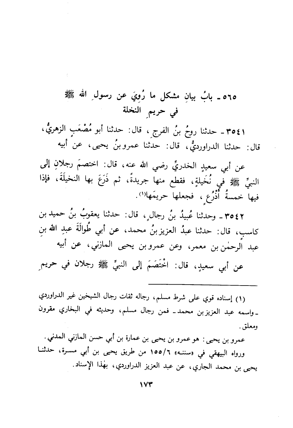 3541 - حَدَّثَنَا رَوْحُ بْنُ الْفَرَجِ قَالَ: حَدَّثَنَا أَبُو مُصْعَبٍ الزُّهْرِيُّ قَالَ: حَدَّثَنَا الدَّرَاوَرْدِيُّ قَالَ: حَدَّثَنَا عَمْرُو بْنُ يَحْيَى , عَنْ أَبِيهِ , عَنْ أَبِي سَعِيدٍ الْخُدْرِيِّ رَضِيَ اللهُ عَنْهُ قَالَ: اخْتَصَمَ رَجُلَانِ إِلَى النَّبِيِّ صَلَّى اللَّهُ عَلَيْهِ وَسَلَّمَ فِي نُخَيْلَةٍ , فَقَطَعَ مِنْهَا جَرِيدَةً , ثُمَّ ذَرَعَ بِهَا النُّخَيْلَةَ , فَإِذَا فِيهَا خَمْسَةُ أَذْرُعٍ , فَجَعَلَهَا حَرِيمَهَا "