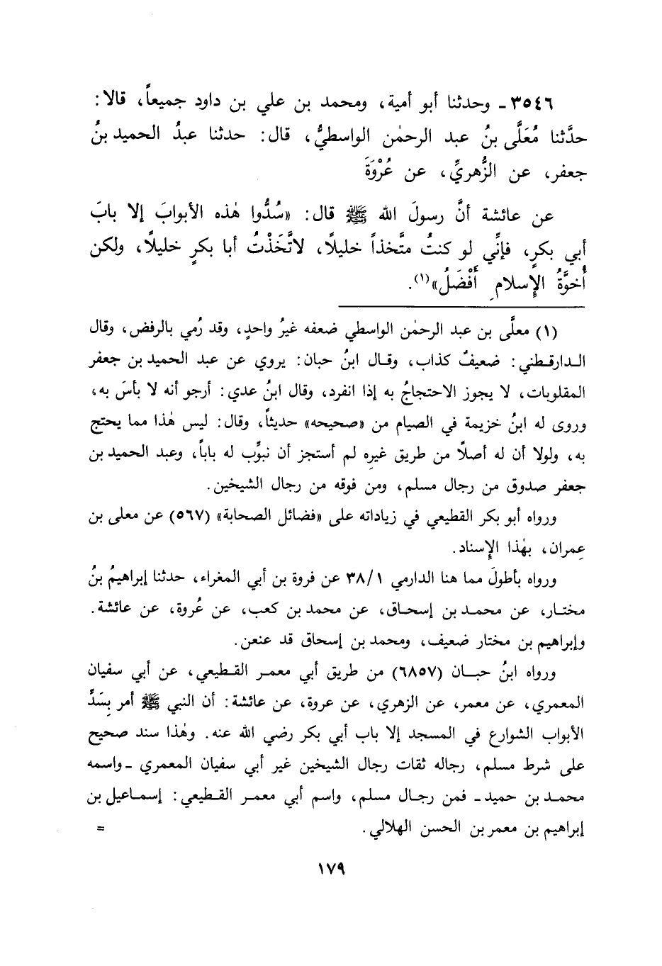 3546 - وَحَدَّثَنَا أَبُو أُمَيَّةَ , وَمُحَمَّدُ بْنُ عَلِيِّ بْنِ دَاوُدَ , جَمِيعًا قَالَا: حَدَّثَنَا مُعَلَّى بْنُ عَبْدِ الرَّحْمَنِ الْوَاسِطِيُّ قَالَ: حَدَّثَنَا عَبْدُ الْحَمِيدِ بْنُ جَعْفَرٍ , عَنِ الزُّهْرِيِّ , عَنْ عُرْوَةَ , عَنْ عَائِشَةَ , أَنَّ رَسُولَ اللهِ صَلَّى اللَّهُ عَلَيْهِ وَسَلَّمَ قَالَ: " سُدُّوا هَذِهِ الْأَبْوَابَ إِلَّا بَابَ أَبِي بَكْرٍ , فَإِنِّي لَوْ كُنْتُ مُتَّخِذًا خَلِيلًا لَاتَّخَذْتُ أَبَا بَكْرٍ خَلِيلًا , وَلَكِنْ أُخُوَّةُ الْإِسْلَامِ أَفْضَلُ "