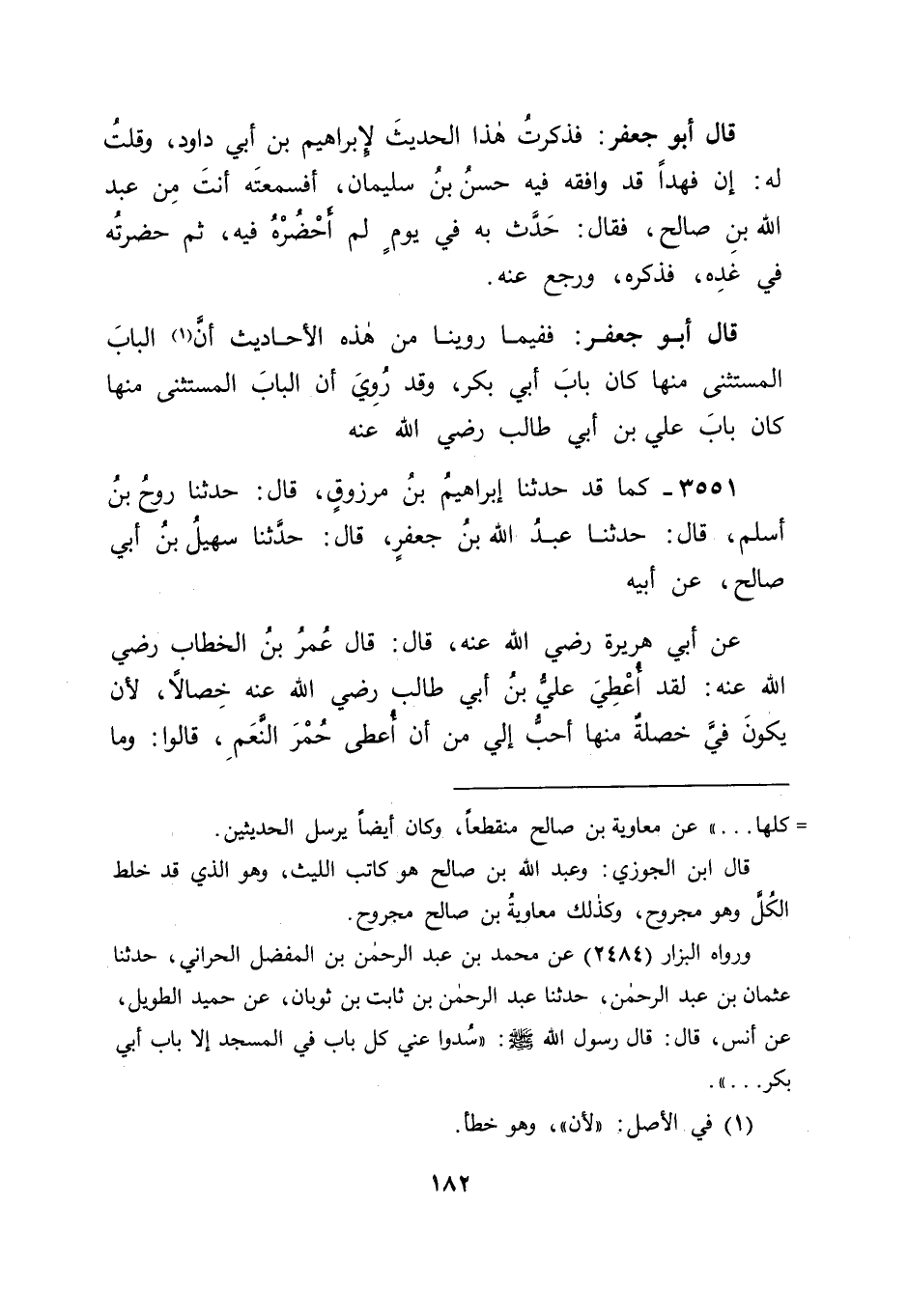3551 - كَمَا قَدْ حَدَّثَنَا إِبْرَاهِيمُ بْنُ مَرْزُوقٍ قَالَ: حَدَّثَنَا رَوْحُ بْنُ أَسْلَمَ قَالَ: حَدَّثَنَا عَبْدُ اللهِ بْنُ جَعْفَرٍ قَالَ: حَدَّثَنَا سُهَيْلُ بْنُ أَبِي صَالِحٍ , عَنْ أَبِيهِ , عَنْ أَبِي هُرَيْرَةَ رَضِيَ اللهُ عَنْهُ قَالَ: قَالَ عُمَرُ بْنُ الْخَطَّابِ رَضِيَ اللهُ عَنْهُ: " لَقَدْ أُعْطِيَ عَلِيُّ بْنُ أَبِي طَالِبٍ رَضِيَ اللهُ عَنْهُ خِصَالًا , لَأَنْ يَكُونَ فِيَّ خَصْلَةٌ مِنْهَا أَحَبُّ إِلَيَّ مِنْ أَنْ أُعْطَى حُمْرَ النَّعَمِ , قَالُوا: وَمَا -[183]- هُنَّ يَا أَمِيرَ الْمُؤْمِنِينَ؟ قَالَ: تَزَوَّجَ فَاطِمَةَ ابْنَةَ رَسُولِ اللهِ صَلَّى اللَّهُ عَلَيْهِ وَسَلَّمَ , وَسُكْنَاهُ الْمَسْجِدَ مَعَ رَسُولِ اللهِ صَلَّى اللَّهُ عَلَيْهِ وَسَلَّمَ , يَحِلُّ لَهُ فِيهِ مَا يَحِلُّ لِرَسُولِ اللهِ صَلَّى اللَّهُ عَلَيْهِ وَسَلَّمَ , وَالرَّايَةُ يَوْمَ خَيْبَرَ " قَالَ أَبُو جَعْفَرٍ: وَعَبْدُ اللهِ بْنُ جَعْفَرٍ الَّذِي عَادَ إِلَيْهِ هَذَا الْحَدِيثُ , إِنْ يَكُنْ هُوَ الْمَخْرَمِيَّ , فَهُوَ مِمَّنْ يُحْمَدُ فِي حَدِيثِهِ , وَإِنْ يَكُنْ هُوَ ابْنَ نَجِيحٍ أَبُو عَلِيِّ بْنَ الْمَدِينِيِّ , فَإِنَّ حَدِيثَهُ لَيْسَ كَحَدِيثِ عَبْدِ اللهِ بْنِ جَعْفَرٍ الْمَخْرَمِيِّ , وَلَكِنَّهُ لَيْسَ بِسَاقِطٍ , قَدْ حَدَّثَ النَّاسُ عَنْهُ , وَأَحَدُ مَنْ حَدَّثَ عَنْهُ ابْنُهُ , وَهُوَ إِمَامُ أَهْلِ الْحَدِيثِ. ثُمَّ نَظَرْنَا: هَلْ رَوَى هَذَا الْحَدِيثَ عَنْ سُهَيْلٍ غَيْرُهُ.