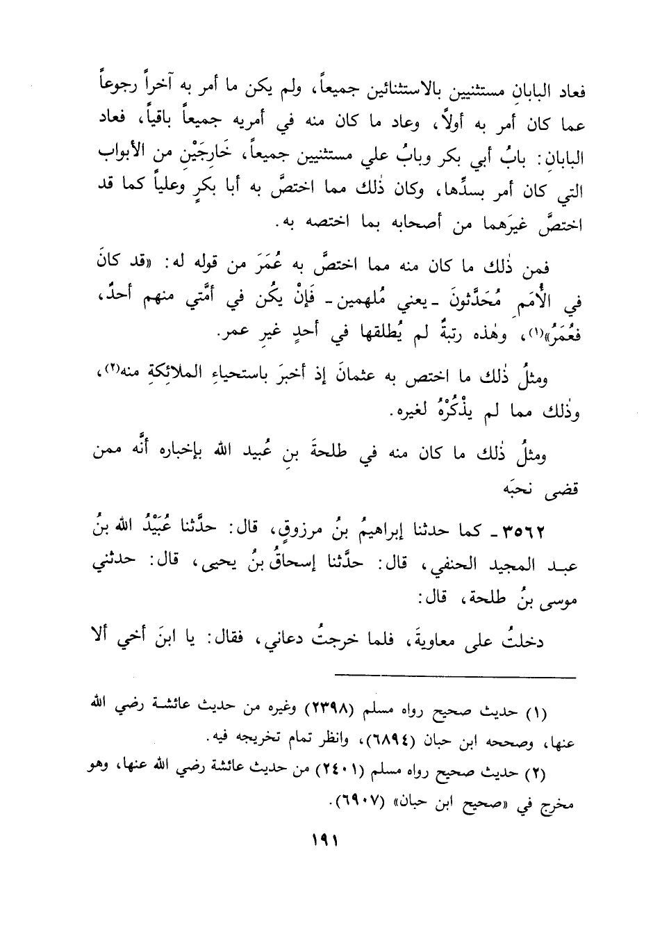 3562 - كَمَا حَدَّثَنَا إِبْرَاهِيمُ بْنُ مَرْزُوقٍ قَالَ: حَدَّثَنَا عُبَيْدُ اللهِ بْنُ عَبْدِ الْمَجِيدِ الْحَنَفِيُّ قَالَ: حَدَّثَنَا إِسْحَاقُ بْنُ يَحْيَى قَالَ: حَدَّثَنِي مُوسَى بْنُ طَلْحَةَ قَالَ: دَخَلْتُ عَلَى مُعَاوِيَةَ , فَلَمَّا خَرَجْتُ دَعَانِي فَقَالَ: يَا ابْنَ أَخِي , أَلَا -[192]- أَضَعُ عِنْدَكَ حَدِيثًا سَمِعْتُهُ مِنْ رَسُولِ اللهِ صَلَّى اللَّهُ عَلَيْهِ وَسَلَّمَ؟ قُلْتُ: بَلَى قَالَ: أَشْهَدُ لَسَمِعْتُ رَسُولَ اللهِ صَلَّى اللَّهُ عَلَيْهِ وَسَلَّمَ يَقُولُ: " طَلْحَةُ قَضَى نَحْبَهُ " -[193]- قَالَ أَبُو جَعْفَرٍ: وَهَذَا مِمَّا لَا نَعْلَمُهُ أُطْلِقَ فِي غَيْرِهِ , وَمَثَلُ ذَلِكَ مَا كَانَ مِنْهُ فِي الزُّبَيْرِ.
