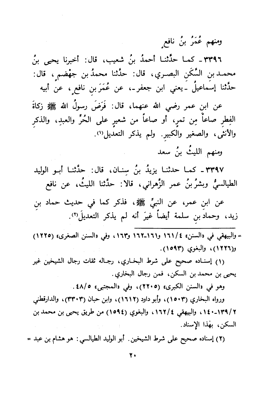 3396 - كَمَا حَدَّثَنَا أَحْمَدُ بْنُ شُعَيْبٍ , قَالَ أَخْبَرَنَا يَحْيَى بْنُ مُحَمَّدِ بْنِ السَّكَنِ الْبَصْرِيُّ , حَدَّثَنَا مُحَمَّدُ بْنُ جَهْضَمٍ , قَالَ: حَدَّثَنَا إِسْمَاعِيلُ يَعْنِي ابْنَ جَعْفَرٍ , عَنْ عُمَرَ بْنِ نَافِعٍ , عَنْ أَبِيهِ , عَنِ ابْنِ عُمَرَ رَضِيَ اللهُ عَنْهُمَا قَالَ: فَرَضَ رَسُولُ اللهِ صَلَّى اللَّهُ عَلَيْهِ وَسَلَّمَ زَكَاةَ الْفِطْرِ صَاعًا مِنْ تَمْرٍ أَوْ صَاعًا مِنْ شَعِيرٍ عَلَى الْحُرِّ وَالْعَبْدِ وَالذَّكَرِ وَالْأُنْثَى وَالصَّغِيرِ وَالْكَبِيرِ وَلَمْ يَذْكُرِ التَّعْدِيلَ. وَمِنْهُمْ اللَّيْثُ بْنُ سَعْدٍ.