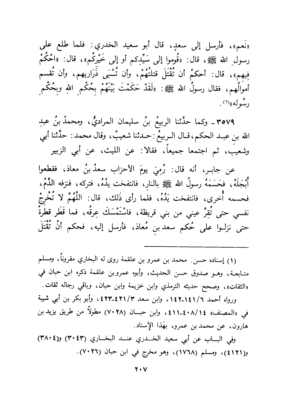 3579 - وَكَمَا حَدَّثَنَا الرَّبِيعُ بْنُ سُلَيْمَانَ الْمُرَادِيُّ , وَمُحَمَّدُ بْنُ عَبْدِ اللهِ بْنِ عَبْدِ الْحَكَمِ , قَالَ الرَّبِيعُ: حَدَّثَنَا شُعَيْبٌ , وَقَالَ مُحَمَّدٌ: حَدَّثَنَا أَبِي , وَشُعَيْبٌ , ثُمَّ اجْتَمَعَا جَمِيعًا فَقَالَا: عَنِ اللَّيْثِ , عَنْ أَبِي الزُّبَيْرِ , عَنْ جَابِرٍ أَنَّهُ قَالَ: " رُمِيَ يَوْمَ الْأَحْزَابِ سَعْدُ بْنُ مُعَاذٍ , فَقَطَعُوا أَبْجَلَهُ , فَحَسَمَهُ رَسُولُ اللهِ صَلَّى اللَّهُ عَلَيْهِ وَسَلَّمَ بِالنَّارِ , فَانْتَفَخَتْ يَدُهُ , فَتَرَكَهُ , فَنَزَفَهُ الدَّمُ , فَحَسَمَهُ أُخْرَى , فَانْتَفَخَتْ يَدُهُ , فَلَمَّا رَأَى ذَلِكَ قَالَ: " اللهُمَّ لَا تُخْرِجْ نَفْسِي , حَتَّى تُقِرَّ عَيْنِي مِنْ بَنِي قُرَيْظَةَ , فَاسْتَمْسَكَ عِرْقُهُ , فَمَا قَطَرَ قَطْرَةً حَتَّى نَزَلُوا عَلَى حُكْمِ سَعْدِ بْنِ مُعَاذٍ , فَأَرْسَلَ إِلَيْهِ , فَحَكَمَ أَنْ تُقْتَلَ -[208]- رِجَالُهُمْ , وَتُسْتَحْيَى نِسَاؤُهُمْ وَذَرَارِيُّهُمْ , لِيَسْتَعِينَ بِهَا الْمُسْلِمُونَ , فَقَالَ رَسُولُ اللهِ صَلَّى اللَّهُ عَلَيْهِ وَسَلَّمَ: " أَصَبْتَ حُكْمَ اللهِ فِيهِمْ " , وَكَانُوا أَرْبَعَ مِائَةٍ , فَلَمَّا فَرَغَ مِنْ قَتْلِهِمُ انْفَتَقَ عِرْقُهُ , فَمَاتَ " قَالَ أَبُو جَعْفَرٍ: أَفَلَا تَرَى أَنَّ سَعْدًا قَدْ حَكَمَ فِي بَنِي قُرَيْظَةَ بِمَا حَكَمَ بِهِ فِيهِمْ قَبْلَ أَنْ يَعْلَمَ مَا حُكْمُ اللهِ فِيهِمْ , فَحَمِدَ رَسُولُ اللهِ صَلَّى اللَّهُ عَلَيْهِ وَسَلَّمَ ذَلِكَ مِنْهُ , فَدَلَّ ذَلِكَ أَنَّ كَذَلِكَ الْأَحْكَامُ فِي الْحَوَادِثِ , يَسْتَعْمِلُ فِيهَا مَنْ إِلَيْهِ الْحُكْمُ فِيهَا رَأْيَهُ بِاجْتِهَادِهِ فِيهَا طَلَبَ الْمَفْرُوضِ عَلَيْهِ فِيهَا , وَأَنَّهُ لَيْسَ عَلَيْهِ إِصَابَةُ حَقَائِقِهَا , إِنَّمَا عَلَيْهِ الِاجْتِهَادُ فِي ذَلِكَ , وَإِنْ كَانَ قَدْ يَقْصُرُ عَنْهُ , وَإِذَا كَانَ ذَلِكَ وَاسِعًا فِي الدِّمَاءِ , وَفِي الْفُرُوجِ , كَانَ فِي الْأَمْوَالِ أَوْسَعَ , وَاللهَ نَسْأَلُهُ التَّوْفِيقَ.