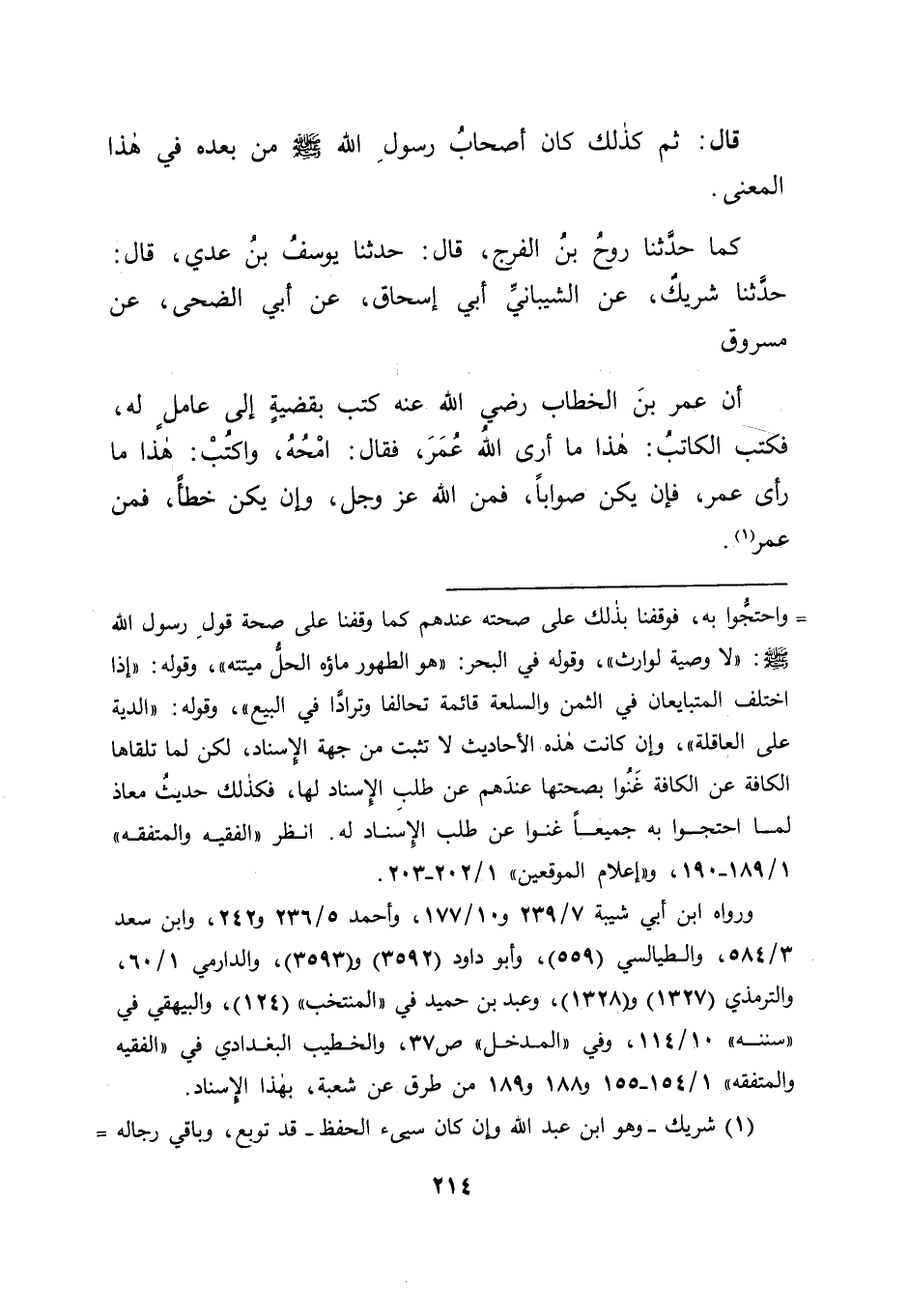 كَمَا حَدَّثَنَا رَوْحُ بْنُ الْفَرَجِ قَالَ: حَدَّثَنَا يُوسُفُ بْنُ عَدِيٍّ قَالَ: حَدَّثَنَا شَرِيكٌ , عَنِ الشَّيْبَانِيِّ أَبِي إِسْحَاقَ , عَنْ أَبِي الضُّحَى , عَنْ مَسْرُوقٍ , أَنَّ عُمَرَ بْنَ الْخَطَّابِ رَضِيَ اللهُ عَنْهُ كَتَبَ بِقَضِيَّةٍ إِلَى عَامِلٍ لَهُ , فَكَتَبَ الْكَاتِبُ: هَذَا مَا أَرَى الله عُمَرَ , فَقَالَ: امْحُهُ وَاكْتُبْ: " هَذَا مَا رَأَى عُمَرُ , فَإِنْ يَكُنْ صَوَابًا فَمِنَ اللهِ عَزَّ وَجَلَّ , وَإِنْ يَكُنْ خَطَأً فَمِنْ عُمَرَ " -[215]- وَمِثْلُ ذَلِكَ مَا كَانَ مِنْ عَبْدِ اللهِ بْنِ مَسْعُودٍ لَمَّا سُئِلَ عَنِ الرَّجُلِ الَّذِي تَزَوَّجَ امْرَأَةً فَلَمْ يَدْخُلْ بِهَا , وَلَمْ يُسَمِّ لَهَا صَدَاقًا حَتَّى تُوُفِّيَ: " أَقُولُ فِيهَا بِرَأْيِي , فَإِنْ يَكُنْ خَطَأً فَمِنْ قِبَلِي , وَإِنْ يَكُنْ صَوَابًا فَمِنِ اللهِ عَزَّ وَجَلَّ ". وَسَنَذْكُرُ ذَلِكَ بِأَسَانِيدِهِ فِي مَوْضِعِهِ فِيمَا بَعْدُ مِنْ كِتَابِنَا هَذَا إِنْ شَاءَ اللهُ. وَفِي ذَلِكَ مَا قَدْ دَلَّ عَلَى أَنَّ مَذْهَبَهُمَا رِضْوَانُ اللهِ عَلَيْهِمَا كَانَ فِي هَذَا الْمَعْنَى , كَمَا صَحَّحْنَا عَلَيْهِ هَذِهِ الْآثَارَ فِي هَذَا الْبَابِ , وَاللهَ نَسْأَلُهُ التَّوْفِيقَ.