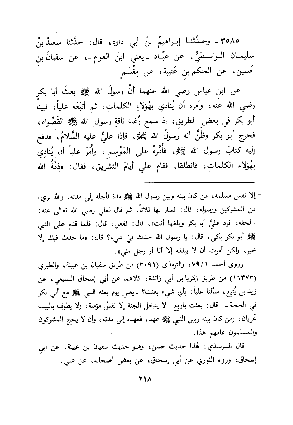 3585 - وَحَدَّثَنَا إِبْرَاهِيمُ بْنُ أَبِي دَاوُدَ قَالَ: حَدَّثَنَا سَعِيدُ بْنُ سُلَيْمَانَ الْوَاسِطِيُّ , عَنْ عَبَّادٍ - يَعْنِي ابْنَ الْعَوَّامِ , عَنْ سُفْيَانَ بْنِ حُسَيْنٍ , عَنِ الْحَكَمِ بْنِ عُتْيْبَةَ , عَنْ مِقْسَمٍ , عَنِ ابْنِ عَبَّاسٍ رَضِيَ اللهُ عَنْهُ: " أَنَّ رَسُولَ اللهِ صَلَّى اللَّهُ عَلَيْهِ وَسَلَّمَ بَعَثَ أَبَا بَكْرٍ رَضِيَ اللهُ عَنْهُ , وَأَمَرَهُ أَنْ يُنَادِيَ بِهَؤُلَاءِ الْكَلِمَاتِ , ثُمَّ أَتْبَعَهُ عَلِيًّا , فَبَيْنَا أَبُو بَكْرٍ فِي بَعْضِ الطَّرِيقِ إِذْ سَمِعَ رُغَاءَ نَاقَةِ رَسُولِ اللهِ صَلَّى اللَّهُ عَلَيْهِ وَسَلَّمَ الْقَصْوَاءِ , فَخَرَجَ أَبُو بَكْرٍ , وَظَنَّ أَنَّهُ رَسُولُ اللهِ صَلَّى اللَّهُ عَلَيْهِ وَسَلَّمَ , فَإِذَا عَلِيُّ عَلَيْهِ السَّلَامُ , فَدَفَعَ إِلَيْهِ كِتَابَ رَسُولِ اللهِ صَلَّى اللَّهُ عَلَيْهِ وَسَلَّمَ , فَأَمَّرَهُ عَلَى الْمَوْسِمِ , وَأَمَرَ عَلِيًّا أَنْ يُنَادِيَ بِهَؤُلَاءِ الْكَلِمَاتِ , فَانْطَلَقَا , فَقَامَ عَلِيٌّ أَيَّامَ التَّشْرِيقِ , فَقَالَ: " ذِمَّةُ اللهِ -[219]- عَزَّ وَجَلَّ وَرَسُولِهِ صَلَّى اللَّهُ عَلَيْهِ وَسَلَّمَ بَرِيئَةٌ مِنْ كُلِّ مُشْرِكٍ , فَسِيحُوا فِي الْأَرْضِ أَرْبَعَةَ أَشْهُرٍ , وَلَا يَحُجَّنَّ بَعْدَ الْعَامِ مُشْرِكٌ , وَلَا يَطُوفَنَّ بِالْبَيْتِ عُرْيَانُ , وَلَا يَدْخُلُ الْجَنَّةَ إِلَّا مُؤْمِنٌ ". قَالَ: فَكَانَ عَلِيٌّ يُنَادِي بِهَا , فَإِذَا بُحَّ , قَامَ أَبُو هُرَيْرَةَ , فَنَادَى بِهَا "