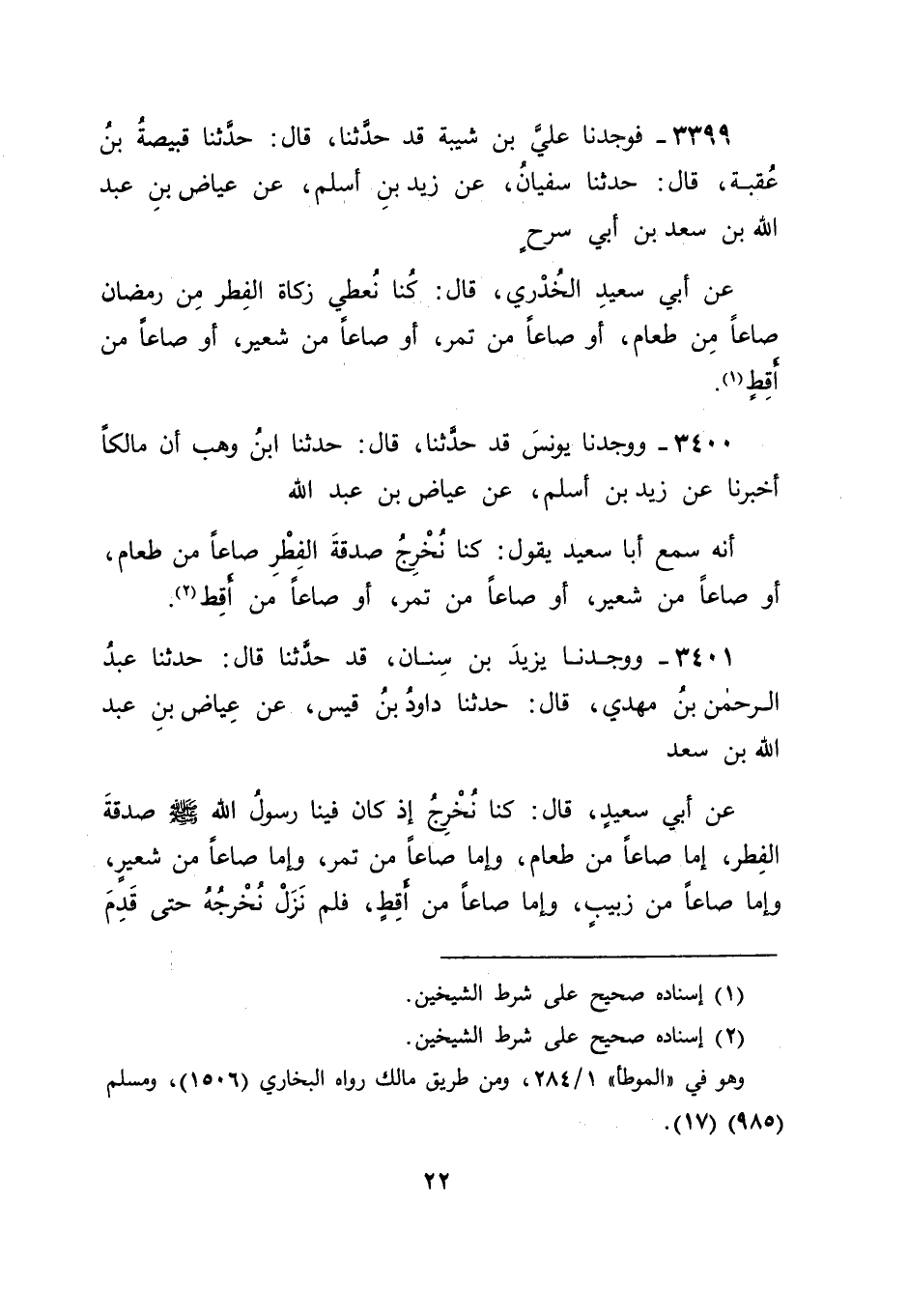 3399 - فَوَجَدْنَا عَلِيَّ بْنَ شَيْبَةَ قَدْ حَدَّثَنَا قَالَ: حَدَّثَنَا قَبِيصَةُ بْنُ عُقْبَةَ , قَالَ حَدَّثَنَا سُفْيَانُ , عَنْ زَيْدِ بْنِ أَسْلَمَ , عَنْ عِيَاضِ بْنِ عَبْدِ اللهِ بْنِ سَعْدِ بْنِ أَبِي سَرْحٍ , عَنْ أَبِي سَعِيدٍ الْخُدْرِيِّ قَالَ: " كُنَّا نُعْطِي زَكَاةَ الْفِطْرِ مِنْ رَمَضَانَ صَاعًا مِنْ طَعَامٍ أَوْ صَاعًا مِنْ تَمْرٍ أَوْ صَاعًا مِنْ شَعِيرٍ أَوْ صَاعًا مِنْ أَقِطٍ "