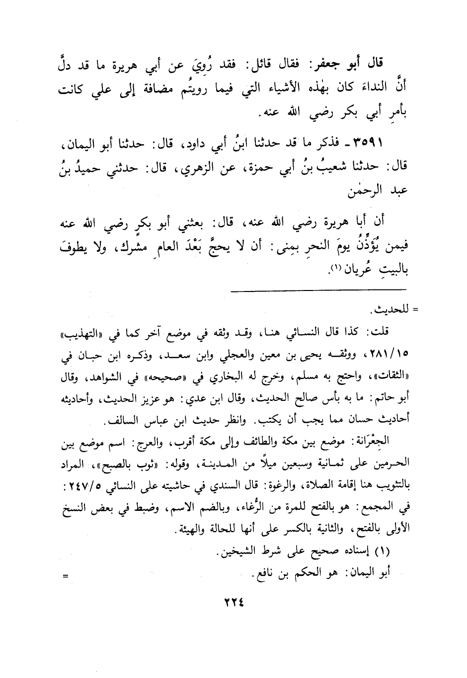 3591 - فَذَكَرَ مَا قَدْ حَدَّثَنَا ابْنُ أَبِي دَاوُدَ قَالَ: حَدَّثَنَا أَبُو الْيَمَانِ قَالَ: حَدَّثَنَا شُعَيْبُ بْنُ أَبِي حَمْزَةَ , عَنِ الزُّهْرِيِّ قَالَ: حَدَّثَنِي حُمَيْدُ بْنُ عَبْدِ الرَّحْمَنِ , أَنَّ أَبَا هُرَيْرَةَ رَضِيَ اللهُ عَنْهُ , قَالَ: " بَعَثَنِي أَبُو بَكْرٍ رَضِيَ اللهُ عَنْهُ فِيمَنْ يُؤَذِّنُ يَوْمَ النَّحْرِ بِمِنًى: أَنْ لَا يَحُجَّ بَعْدَ الْعَامِ مُشْرِكٌ , وَلَا يَطُوفَ بِالْبَيْتِ عُرْيَانٌ "