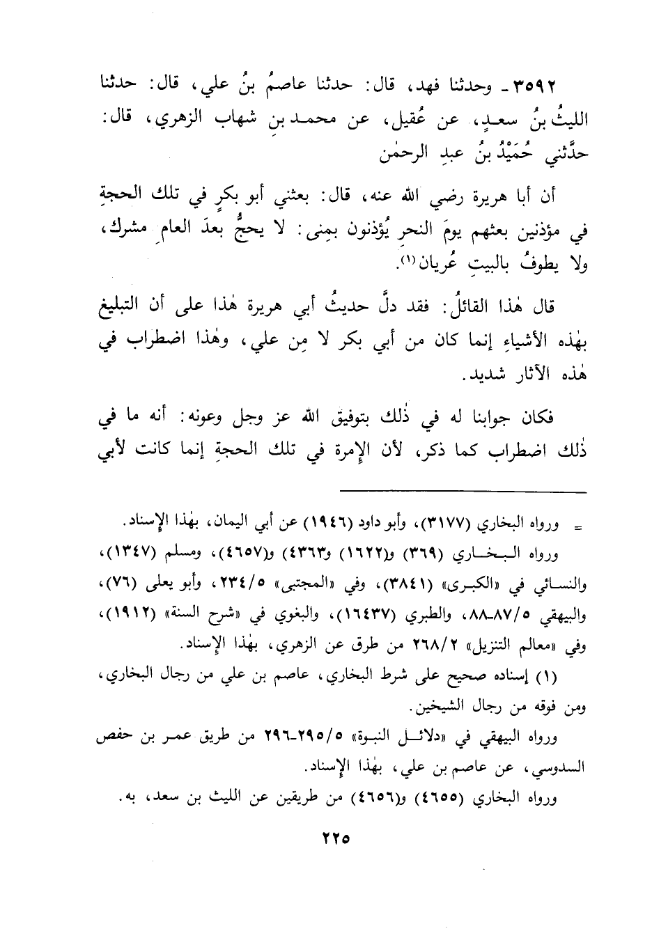 3592 - وَحَدَّثَنَا فَهْدٌ قَالَ: حَدَّثَنَا عَاصِمُ بْنُ عَلِيٍّ قَالَ: حَدَّثَنَا اللَّيْثُ بْنُ سَعِيدٍ , عَنْ عَقِيلٍ , عَنْ مُحَمَّدِ بْنِ شِهَابٍ الزُّهْرِيِّ قَالَ: حَدَّثَنِي حُمَيْدُ بْنُ عَبْدِ الرَّحْمَنِ , أَنَّ أَبَا هُرَيْرَةَ رَضِيَ اللهُ عَنْهُ قَالَ: " بَعَثَنِي أَبُو بَكْرٍ فِي تِلْكَ الْحِجَّةِ فِي مُؤَذِّنِينَ بَعَثَهُمْ يَوْمَ النَّحْرِ يُؤَذِّنُونَ بِمِنًى: لَا يَحُجُّ بَعْدَ الْعَامِ مُشْرِكٌ , وَلَا يَطُوفُ بِالْبَيْتِ عُرْيَانٌ " قَالَ هَذَا الْقَائِلُ: فَقَدْ دَلَّ حَدِيثُ أَبِي هُرَيْرَةَ هَذَا عَلَى أَنَّ التَّبْلِيغَ بِهَذِهِ الْأَشْيَاءِ إِنَّمَا كَانَ مِنْ أَبِي بَكْرٍ , لَا مِنْ عَلِيٍّ , وَهَذَا اضْطِرَابٌ فِي هَذِهِ الْآثَارِ شَدِيدٌ. فَكَانَ جَوَابُنَا لَهُ فِي ذَلِكَ بِتَوْفِيقِ اللهِ عَزَّ وَجَلَّ وَعَوْنِهِ: أَنَّهُ مَا فِي ذَلِكَ اضْطِرَابٌ كَمَا ذَكَرَ؛ لِأَنَّ الْإِمْرَةَ فِي تِلْكَ الْحِجَّةِ , إِنَّمَا كَانَتْ لِأَبِي -[226]- بَكْرٍ خَاصَّةً , لَا شَرِيكَ لَهُ فِيهَا , وَكَانَتِ الطَّاعَةُ فِي الْأَمْرِ وَالنَّهْيِ الَّذِي يَكُونُ فِيهَا إِلَى أَبِي بَكْرٍ لَا إِلَى سِوَاهُ , فَمِنْ أَجْلِ ذَلِكَ بَعَثَ أَبَا هُرَيْرَةَ فِي الْمُؤَذِّنِينَ الَّذِينَ كَانُوا مَعَهُ لِيَمْتَثِلُوا مَا يَأْمُرُهُمْ بِهِ عَلِيٌّ رَضِيَ اللهُ عَنْهُ فِيمَا بَعَثَهُ رَسُولُ اللهِ صَلَّى اللَّهُ عَلَيْهِ وَسَلَّمَ لَهُ , وَقَدْ دَلَّ عَلَى ذَلِكَ.