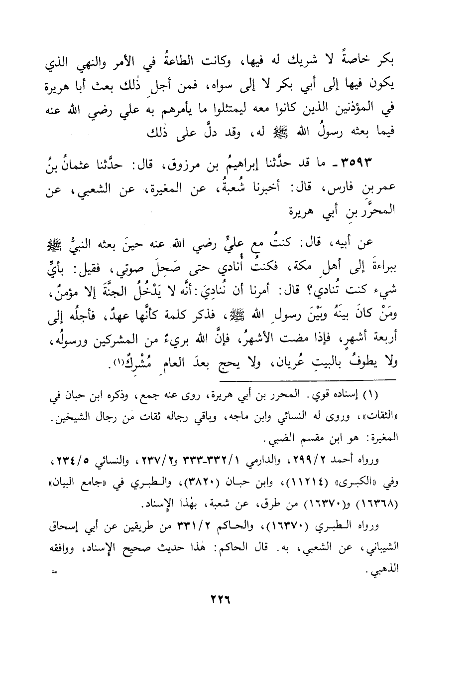 3593 - مَا قَدْ حَدَّثَنَا إِبْرَاهِيمُ بْنُ مَرْزُوقٍ قَالَ: حَدَّثَنَا عُثْمَانُ بْنُ عُمَرَ بْنِ فَارِسٍ قَالَ: أَخْبَرَنَا شُعْبَةُ , عَنِ الْمُغِيرَةِ , عَنِ الشَّعْبِيِّ , عَنِ الْمُحَرَّرِ بْنِ أَبِي هُرَيْرَةَ , عَنْ أَبِيهِ قَالَ: " كُنْتُ مَعَ عَلِيٍّ رَضِيَ اللهُ عَنْهُ حِينَ بَعَثَهُ النَّبِيُّ صَلَّى اللَّهُ عَلَيْهِ وَسَلَّمَ بِبَرَاءَةٌ إِلَى أَهْلِ مَكَّةَ , فَكُنْتُ أُنَادِي حَتَّى صَحِلَ صَوْتِي , فَقِيلَ: بِأَيِّ شَيْءٍ كُنْتَ تُنَادِي؟ قَالَ: أَمَرَنَا أَنْ نُنَادِيَ: أَنَّهُ لَا يَدْخُلُ الْجَنَّةَ إِلَّا مُؤْمِنٌ , وَمَنْ كَانَ بَيْنَهُ وَبَيْنَ رَسُولِ اللهِ صَلَّى اللَّهُ عَلَيْهِ وَسَلَّمَ , فَذَكَرَ كَلِمَةً كَأَنَّهَا عَهْدٌ , فَأَجَلُهُ إِلَى أَرْبَعَةِ أَشْهُرٍ , فَإِذَا مَضَتِ الْأَشْهُرُ , فَإِنَّ اللهَ بَرِيءٌ مِنَ الْمُشْرِكِينَ وَرَسُولُهُ , وَلَا يَطُوفُ بِالْبَيْتِ عُرْيَانٌ , وَلَا يَحُجُّ بَعْدَ الْعَامِ مُشْرِكٌ " -[227]- قَالَ أَبُو جَعْفَرٍ: فَدَلَّ ذَلِكَ عَلَى أَنَّ نِدَاءَ أَبِي هُرَيْرَةَ إِنَّمَا كَانَ بِمَا يُلْقِيهِ عَلِيٌّ عَلَيْهِ , وَأَنَّ مَصِيرَهُ كَانَ إِلَى عَلِيٍّ كَانَ بِأَمْرِ أَبِي بَكْرٍ؛ لِأَنَّ الْأَمْرَ كَانَ إِلَيْهِ , إِذْ كَانَ هُوَ الْأَمِيرُ فِي تِلْكَ الْحِجَّةِ , حَتَّى رَجَعَ إِلَى رَسُولِ اللهِ صَلَّى اللَّهُ عَلَيْهِ وَسَلَّمَ مُنْصَرِفًا مِنْهَا. وَفِيمَا بَيَّنَّا مِنْ ذَلِكَ عُلُوُّ الْمَرْتَبَةِ لِأَبِي بَكْرٍ رَضِيَ اللهُ عَنْهُ فِي إِمْرَتِهِ عَلَى الْمُبَلِّغِ عَنْ رَسُولِ اللهِ صَلَّى اللَّهُ عَلَيْهِ وَسَلَّمَ فِيمَا لَا يَصْلُحُ أَنْ يَكُونَ الْمُبَلِّغُ لَهُ عَنْهُ إِلَّا هُوَ. وَفِيهِ أَيْضًا عُلُوُ مَرْتَبَةِ عَلِيٍّ رَضِيَ اللهُ عَنْهُ فِي اخْتِصَاصِ رَسُولِ اللهِ صَلَّى اللَّهُ عَلَيْهِ وَسَلَّمَ إِيَّاهُ بِمَا اخْتَصَّهُ بِهِ مِنَ التَّبْلِيغِ عَنْهُ , وَفِي ذَلِكَ مَا يَجِبُ عَلَى أَهْلِ الْعِلْمِ الْوُقُوفُ عَلَى مَنْزِلَةِ كُلِّ وَاحِدٍ مِنْهُمَا حَتَّى يُؤْتُوهُ مَا جَعَلَهُ اللهُ لَهُ , وَلَا يَنْتَقِصُوهُ مِنْهُ شَيْئًا. وَاللهَ نَسْأَلُهُ التَّوْفِيقَ.