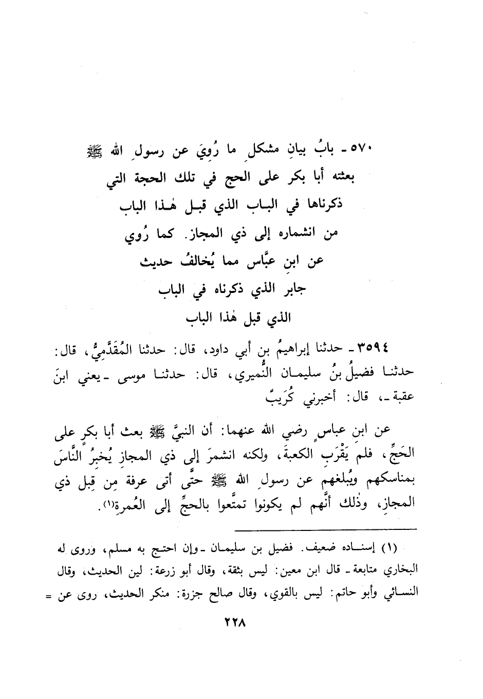 3594 - حَدَّثَنَا إِبْرَاهِيمُ بْنُ أَبِي دَاوُدَ قَالَ: حَدَّثَنَا الْمُقَدَّمِيُّ قَالَ: حَدَّثَنَا فُضَيْلُ بْنُ سُلَيْمَانَ النُّمَيْرِيُّ قَالَ: حَدَّثَنَا مُوسَى - يَعْنِي ابْنَ عُقْبَةَ قَالَ: أَخْبَرَنِي كُرَيْبٌ , عَنِ ابْنِ عَبَّاسٍ رَضِيَ اللهُ عَنْهُمَا: أَنَّ النَّبِيَّ صَلَّى اللَّهُ عَلَيْهِ وَسَلَّمَ بَعَثَ أَبَا بَكْرٍ عَلَى الْحَجِّ , فَلَمْ يَقْرَبِ الْكَعْبَةَ , وَلَكِنَّهُ انْشَمَرَ إِلَى ذِي الْمَجَازِ يُخْبِرُ النَّاسَ بِمَنَاسِكِهِمْ , وَيُبَلِّغُهُمْ عَنْ رَسُولِ اللهِ صَلَّى اللَّهُ عَلَيْهِ وَسَلَّمَ , حَتَّى أَتَى عَرَفَةَ مِنْ قِبَلِ ذِي الْمَجَازِ , وَذَلِكَ أَنَّهُمْ لَمْ يَكُونُوا تَمَتَّعُوا بِالْحَجِّ إِلَى الْعُمْرَةَ " -[229]- فَقَالَ قَائِلٌ: كَيْفَ تَقْبَلُونَ هَذَا , وَفِيهِ تَرْكُ أَشْيَاءَ مِنْ أَسْبَابِ الْحَجِّ؟ وَهِيَ طَوَافُ الْقُدُومِ , وَالْخُطْبَةُ فِي مَكَّةَ فِي الْيَوْمِ الَّذِي قَبْلَ يَوْمِ التَّرْوِيَةِ , وَاللَّبْثُ بِمِنًى الْوَقْتَ الَّذِي يَلْبَثُهُ الْحَاجُّ فِيهَا , ثُمَّ يَصِيرُونَ مِنْهَا إِلَى عَرَفَةَ؟ فَكَانَ جَوَابُنَا لَهُ فِي ذَلِكَ بِتَوْفِيقِ اللهِ عَزَّ وَجَلَّ وَعَوْنِهِ: أَنَّ الَّذِيَ كَانَ مِنْ أَبِي بَكْرٍ مِمَّا فِي هَذَا الْحَدِيثِ , كَانَ لِمَعْنًى يَجِبُ الْوُقُوفُ عَلَيْهِ وَيُعْلَمُ؛ لِأَنَّهُ كَانَ سُوقُ ذِي الْمَجَازِ أَحَدَ الْأَسْوَاقِ الَّتِي كَانَتِ الْعَرَبُ يَجْتَمِعُونَ فِيهَا لِلتَّبَايُعِ وَالتِّجَارَاتِ , فَمِنْهُمْ مَنْ يَحُجُّ , وَمِنْهُمْ مَنْ يَنْصَرِفُ إِلَى دَارِهِ بِلَا حَجٍّ , فَأَرَادَ أَبُو بَكْرٍ رَضِيَ اللهُ عَنْهُ أَنْ يَجْتَمِعُوا فِي مَوْسَمِ الْحَجِّ لِيَسْمَعُوا مَا يُقْرَأُ عَلَيْهِمْ فِيهِ مِمَّا بَعَثَ رَسُولُ اللهِ صَلَّى اللَّهُ عَلَيْهِ وَسَلَّمَ لَهُ عَلِيًّا رَضِيَ اللهُ عَنْهُ. فَمِمَّا رُوِيَ فِي سُوقِ ذِي الْمَجَازِ أَنَّهُ كَانَ كَذَلِكَ.
