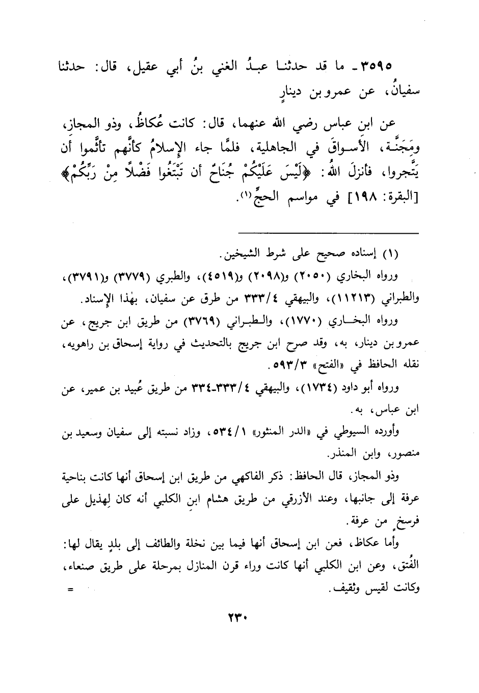 3595 - مَا قَدْ حَدَّثَنَا عَبْدُ الْغَنِيِّ بْنُ أَبِي عَقِيلٍ قَالَ: حَدَّثَنَا سُفْيَانُ , عَنْ عَمْرِو بْنِ دِينَارٍ , عَنِ ابْنِ عَبَّاسٍ رَضِيَ اللهُ عَنْهُمَا قَالَ: " كَانَتْ عُكَاظُ , وَذُو الْمَجَازِ , وَمَجَنَّةُ , الْأَسْوَاقَ فِي الْجَاهِلِيَّةِ , فَلَمَّا جَاءَ الْإِسْلَامُ كَأَنَّهُمْ تَأَثَّمُوا أَنْ يَتَّجِرُوا , فَأَنْزَلَ اللهُ: {لَيْسَ عَلَيْكُمْ جُنَاحٌ أَنْ تَبْتَغُوا فَضْلًا مِنْ رَبِّكُمْ} [البقرة: 198] , فِي مَوَاسِمِ الْحَجِّ "
