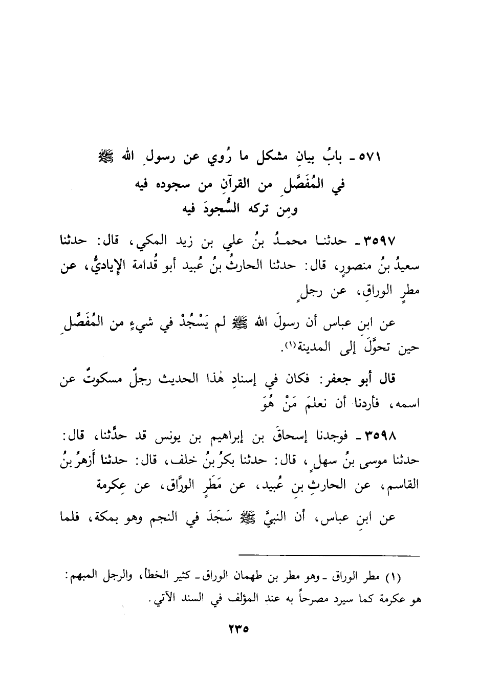 3597 - حَدَّثَنَا مُحَمَّدُ بْنُ عَلِيِّ بْنِ زَيْدٍ الْمَكِّيُّ قَالَ: حَدَّثَنَا سَعِيدُ بْنُ مَنْصُورٍ قَالَ: حَدَّثَنَا الْحَارِثُ بْنُ عُبَيْدٍ أَبُو قُدَامَةَ الْإِيَادِيُّ , عَنْ مَطَرٍ الْوَرَّاقِ , عَنْ رَجُلٍ , عَنِ ابْنِ عَبَّاسٍ: " أَنَّ رَسُولَ اللهِ صَلَّى اللَّهُ عَلَيْهِ وَسَلَّمَ لَمْ يَسْجُدْ فِي شَيْءٍ مِنَ الْمُفَصَّلِ حِينَ تَحَوَّلَ إِلَى الْمَدِينَةِ " قَالَ أَبُو جَعْفَرٍ: فَكَانَ فِي إِسْنَادِ هَذَا الْحَدِيثِ رَجُلٌ مَسْكُوتٌ عَنِ اسْمِهِ , فَأَرَدْنَا أَنْ نَعْلَمَ مَنْ هُوَ.