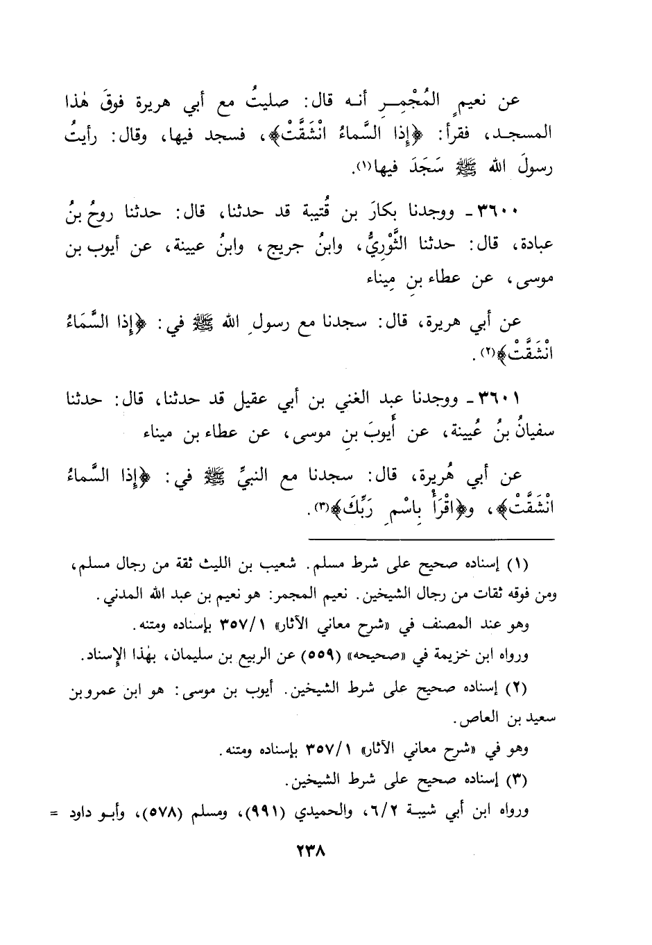 3601 - وَوَجَدْنَا عَبْدَ الْغَنِيِّ بْنَ أَبِي عَقِيلٍ قَدْ حَدَّثَنَا قَالَ: حَدَّثَنَا سُفْيَانُ بْنُ عُيَيْنَةَ , عَنْ أَيُّوبَ بْنِ مُوسَى , عَنْ عَطَاءِ بْنِ مِينَاءَ , عَنْ أَبِي هُرَيْرَةَ قَالَ: " سَجَدْنَا مَعَ النَّبِيِّ صَلَّى اللَّهُ عَلَيْهِ وَسَلَّمَ فِي: إِذَا السَّمَاءُ انْشَقَّتْ , وَاقْرَأْ بِاسْمِ رَبِّكَ "
