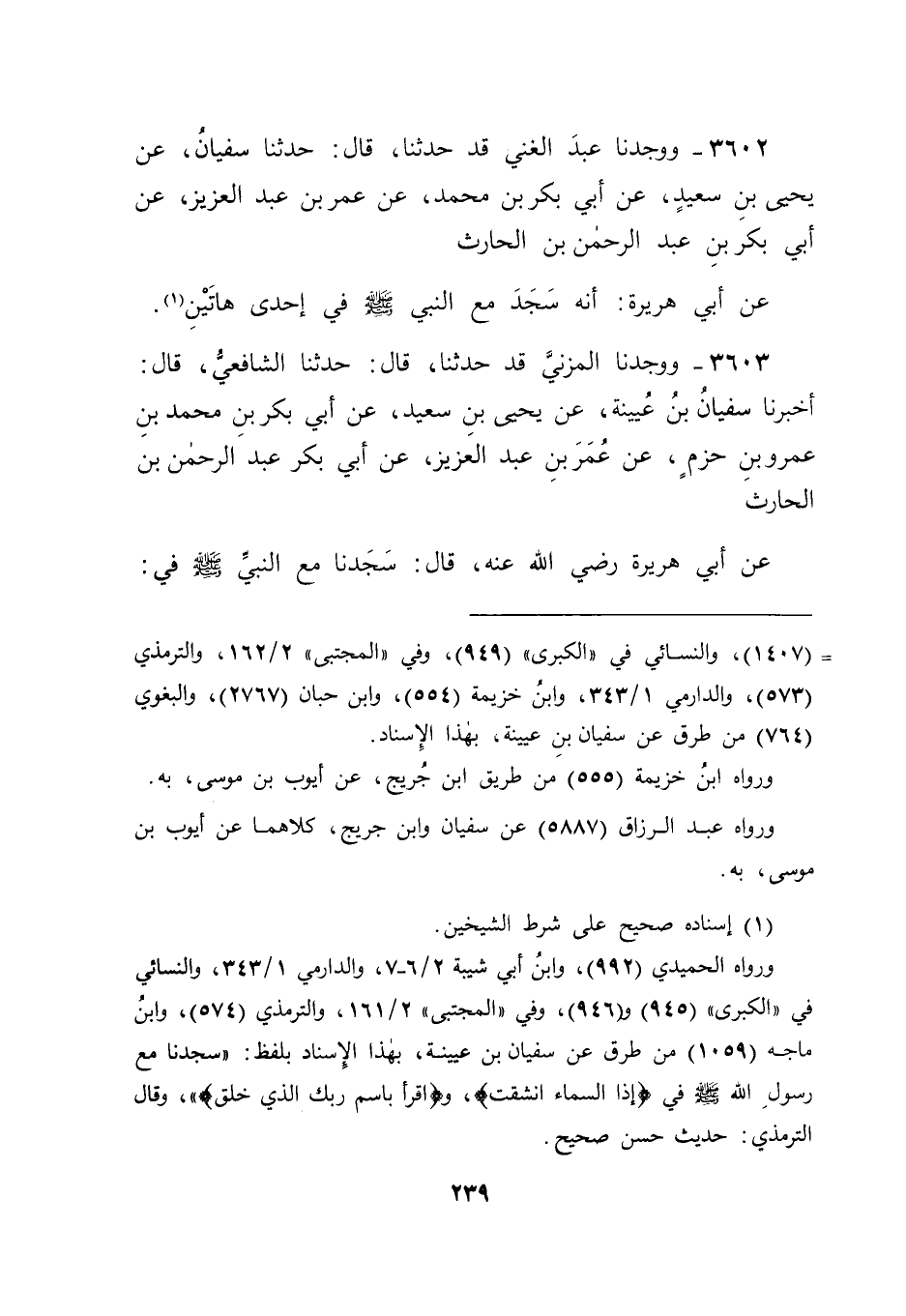3603 - وَوَجَدْنَا الْمُزَنِيَّ قَدْ حَدَّثَنَا قَالَ: حَدَّثَنَا الشَّافِعِيُّ قَالَ: أَخْبَرَنَا سُفْيَانُ بْنُ عُيَيْنَةَ , عَنْ يَحْيَى بْنِ سَعِيدٍ , عَنْ أَبِي بَكْرِ بْنِ مُحَمَّدِ بْنِ عَمْرِو بْنِ حَزْمٍ , عَنْ عُمَرَ بْنِ عَبْدِ الْعَزِيزِ , عَنْ أَبِي بَكْرٍ عَبْدِ الرَّحْمَنِ بْنِ الْحَارِثِ , عَنْ أَبِي هُرَيْرَةَ رَضِيَ اللهُ عَنْهُ قَالَ: " سَجَدْنَا مَعَ النَّبِيِّ صَلَّى اللَّهُ عَلَيْهِ وَسَلَّمَ فِي: -[240]- إِذَا السَّمَاءُ انْشَقَّتْ "