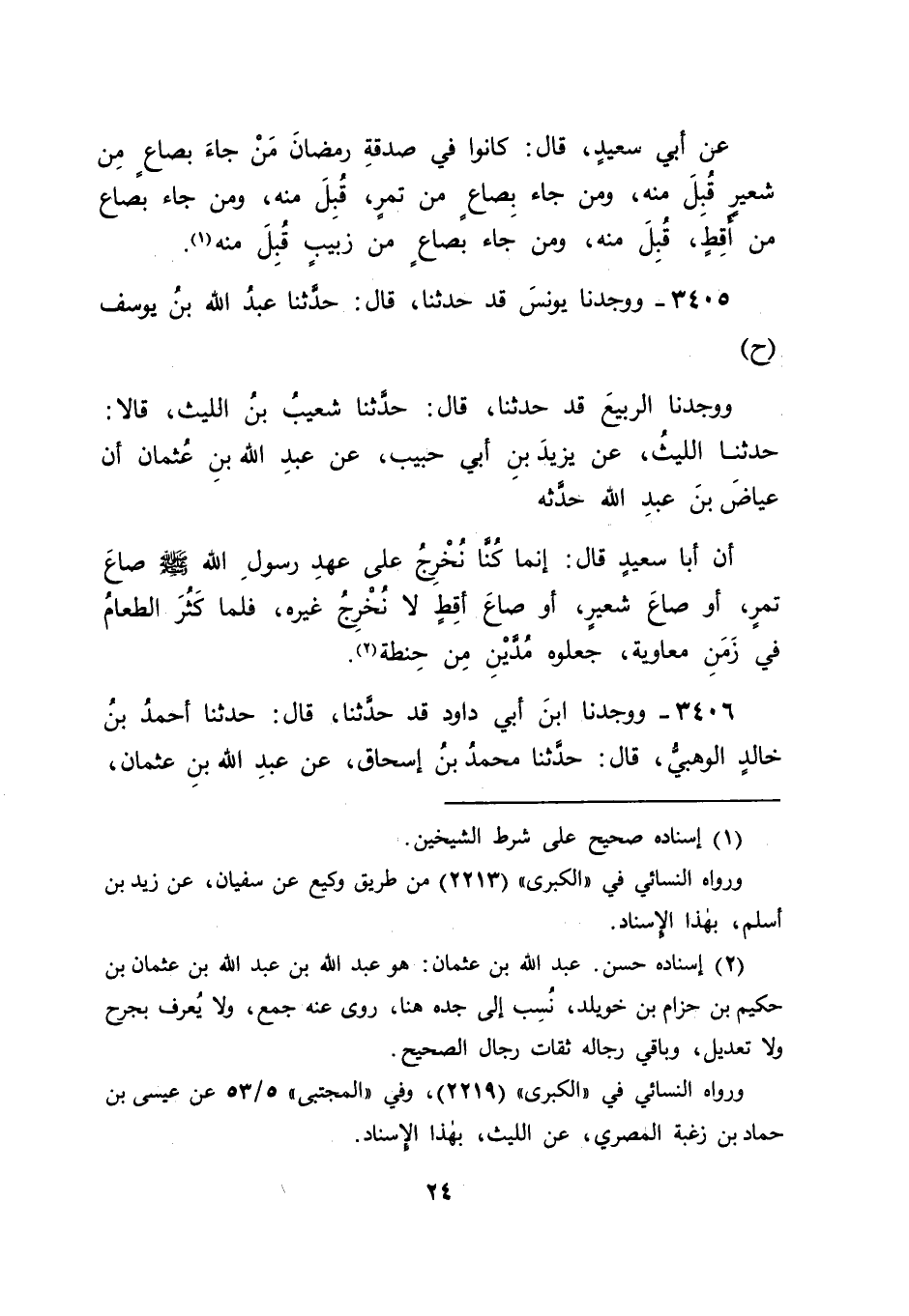 3405 - وَوَجَدْنَا: يُونُسَ قَدْ حَدَّثَنَا قَالَ: حَدَّثَنَا عَبْدُ اللهِ بْنُ يُوسُفَ ح وَوَجَدْنَا الرَّبِيعَ قَدْ حَدَّثَنَا قَالَ: حَدَّثَنَا شُعَيْبُ بْنُ اللَّيْثِ قَالَا: حَدَّثَنَا اللَّيْثُ , عَنْ يَزِيدَ بْنِ أَبِي حَبِيبٍ , عَنْ عَبْدِ اللهِ بْنِ عُثْمَانَ أَنَّ عِيَاضَ بْنَ عَبْدِ اللهِ , حَدَّثَهُ أَنَّ أَبَا سَعِيدٍ قَالَ: " إِنَّمَا كُنَّا نُخْرِجُ عَلَى عَهْدِ رَسُولِ اللهِ صَلَّى اللَّهُ عَلَيْهِ وَسَلَّمَ صَاعَ تَمْرٍ أَوْ صَاعَ شَعِيرٍ أَوْ صَاعَ أَقِطٍ لَا نُخْرِجُ غَيْرَهُ , فَلَمَّا كَثُرَ الطَّعَامُ فِي زَمَنِ مُعَاوِيَةَ جَعَلُوهُ مُدَّيْنِ مِنْ حِنْطَةٍ "