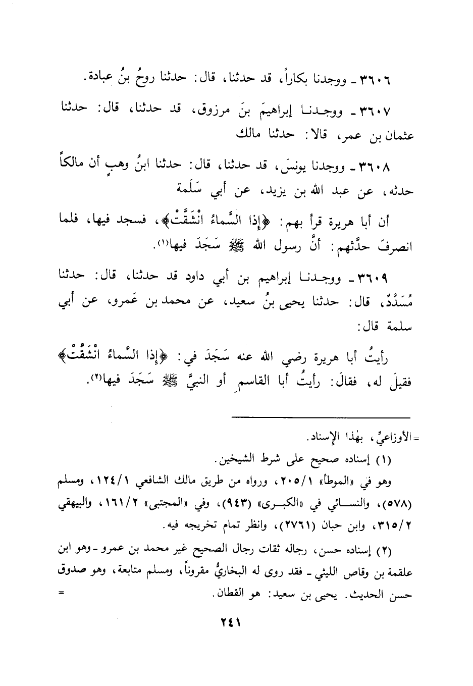 3609 - وَوَجَدْنَا إِبْرَاهِيمَ بْنَ أَبِي دَاوُدَ قَدْ حَدَّثَنَا قَالَ: حَدَّثَنَا مُسَدَّدٌ قَالَ: حَدَّثَنَا يَحْيَى بْنُ سَعِيدٍ , عَنْ مُحَمَّدِ بْنِ عَمْرٍو , عَنْ أَبِي سَلَمَةَ قَالَ: رَأَيْتُ أَبَا هُرَيْرَةَ رَضِيَ اللهُ عَنْهُ سَجَدَ فِي: إِذَا السَّمَاءُ انْشَقَّتْ , فَقِيلَ لَهُ فَقَالَ: " رَأَيْتُ أَبَا الْقَاسِمِ , أَوِ النَّبِيَّ صَلَّى اللَّهُ عَلَيْهِ وَسَلَّمَ سَجَدَ فِيهَا "