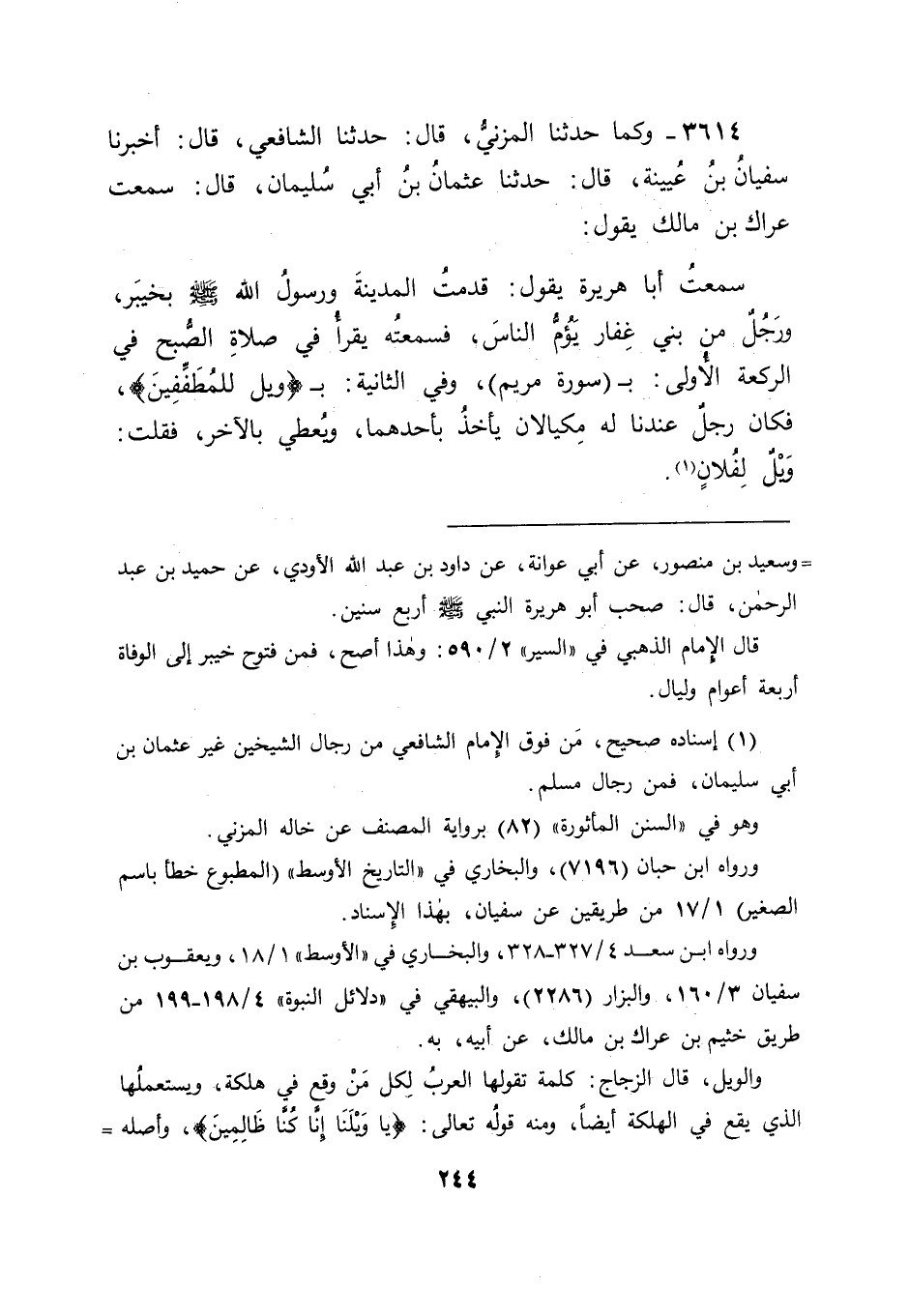 3614 - وَكَمَا حَدَّثَنَا الْمُزَنِيُّ قَالَ: حَدَّثَنَا الشَّافِعِيُّ قَالَ: أَخْبَرَنَا سُفْيَانُ بْنُ عُيَيْنَةَ قَالَ: حَدَّثَنَا عُثْمَانُ بْنُ أَبِي سُلَيْمَانَ قَالَ: سَمِعْتُ عِرَاكَ بْنَ مَالِكٍ يَقُولُ: سَمِعْتُ أَبَا هُرَيْرَةَ يَقُولُ: " قَدِمْتُ الْمَدِينَةَ وَرَسُولُ اللهِ صَلَّى اللَّهُ عَلَيْهِ وَسَلَّمَ بِخَيْبَرَ , وَرَجُلٌ مِنْ بَنِي غِفَارٍ يَؤُمُّ النَّاسَ , فَسَمِعْتُهُ يَقْرَأُ فِي صَلَاةِ الصُّبْحِ فِي الرَّكْعَةِ الْأُولَى: بِسُورَةِ مَرْيَمَ , وَفِي الثَّانِيَةِ بِ: وَيْلٌ لِلْمُطَفِّفِينَ , فَكَانَ رَجُلٌ عِنْدَنَا لَهُ مِكْيَالِانِ , يَأْخُذُ بِأَحَدِهِمَا , وَيُعْطِي بِالْآخَرِ , فَقُلْتُ: " وَيْلٌ لِفُلَانٍ " -[245]- فَكَانَ مَا رُوِّينَاهُ عَنْ أَبِي هُرَيْرَةَ مِنْ هَذَا يُخَالِفُ مَا رُوِّينَاهُ عَنِ ابْنِ عَبَّاسٍ فِيهِ؛ لِأَنَّ الَّذِي رُوِّينَاهُ عَنِ ابْنِ عَبَّاسٍ فِيهِ إِخْبَارُهُ بِتَرْكِ رَسُولِ اللهِ صَلَّى اللَّهُ عَلَيْهِ وَسَلَّمَ السُّجُودَ فِي الْمُفَصَّلِ بَعْدَ أَنْ قَدِمَ الْمَدِينَةَ , وَفِي هَذَا سُجُودُهُ فِيهِ بَعْدَ أَنْ قَدِمَ الْمَدِينَةَ , وَكَانَ هَذَا عِنْدَنَا أَوْلَى؛ لِأَنَّ إِثْبَاتَ الْأَشْيَاءِ أَوْلَى مِنْ نَفْيِهَا , وَقَدْ يَجُوزُ أَنْ يَكُونَ ابْنُ عَبَّاسٍ قَالَ مِنْ ذَلِكَ مَا رُوِّينَاهُ عَنْهُ؛ لِأَنَّهُ لَمْ يَرَ رَسُولَ اللهِ صَلَّى اللَّهُ عَلَيْهِ وَسَلَّمَ فَعَلَهُ بَعْدَ أَنْ قَدِمَ الْمَدِينَةَ , وَكَانَ مَنْ ذَكَرَ أَنَّهُ فَعَلَهُ بَعْدَ أَنْ قَدِمَهَا أَوْلَى. فَقَالَ قَائِلٌ: فَقَدْ شَدَّ مَا قَالَ ابْنُ عَبَّاسٍ فِي ذَلِكَ مَا قَدْ رُوِيَ عَنْ زَيْدِ بْنِ ثَابِتٍ فِيهِ.