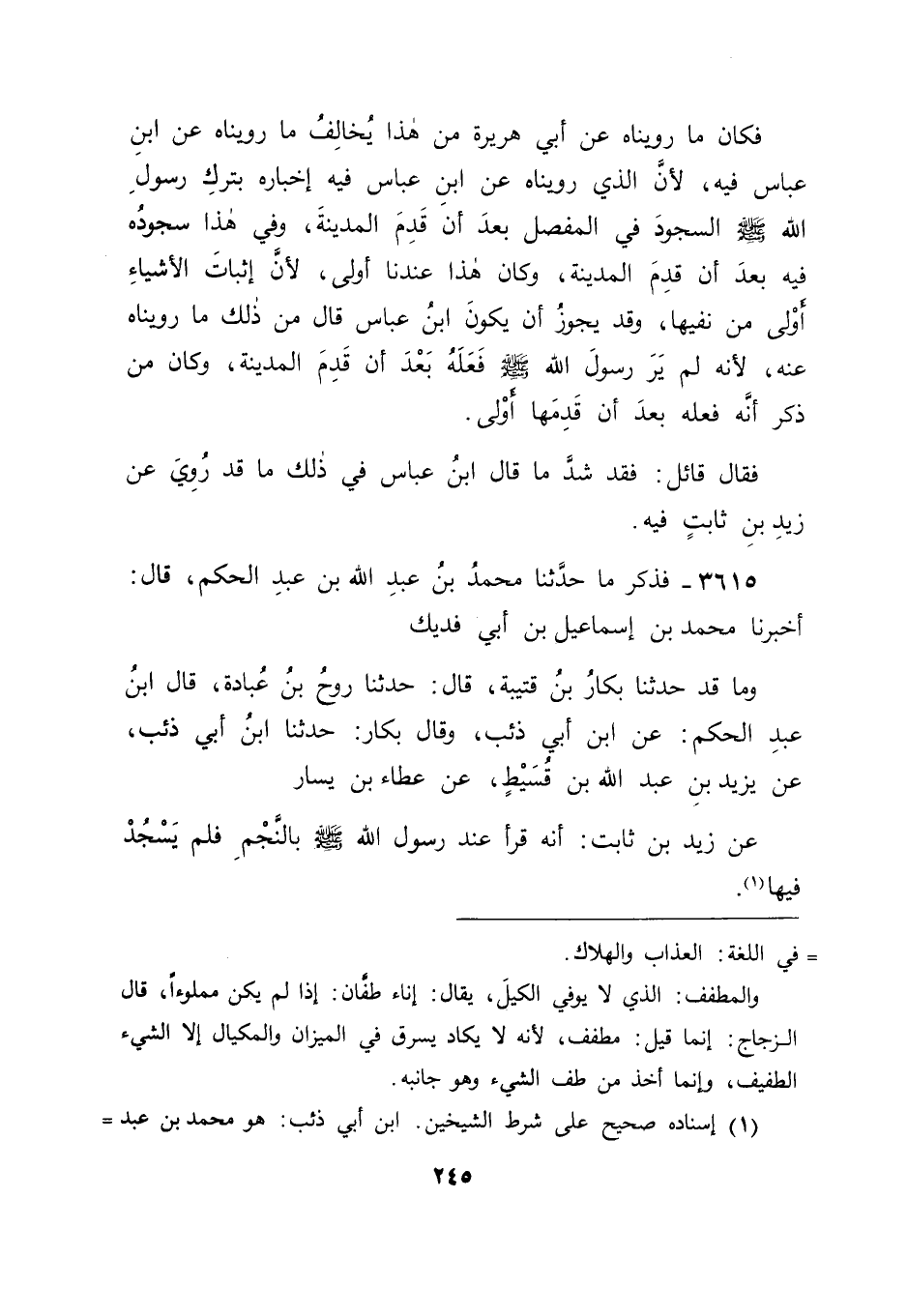 3615 - فَذَكَرَ مَا حَدَّثَنَا مُحَمَّدُ بْنُ عَبْدِ اللهِ بْنِ عَبْدِ الْحَكَمِ قَالَ: أَخْبَرَنَا مُحَمَّدُ بْنُ إِسْمَاعِيلَ بْنِ أَبِي فُدَيْكٍ وَمَا قَدْ حَدَّثَنَا بَكَّارُ بْنُ قُتَيْبَةَ قَالَ: حَدَّثَنَا رَوْحُ بْنُ عُبَادَةَ , قَالَ ابْنُ عَبْدِ الْحَكَمِ: عَنِ ابْنِ أَبِي ذِئْبٍ , وَقَالَ بَكَّارٌ: حَدَّثَنَا ابْنُ أَبِي ذِئْبٍ , عَنْ يَزِيدَ بْنِ عَبْدِ اللهِ بْنِ قُسَيْطٍ , عَنْ عَطَاءِ بْنِ يَسَارٍ , عَنْ زَيْدِ بْنِ ثَابِتٍ: " أَنَّهُ قَرَأَ عِنْدَ رَسُولِ اللهِ صَلَّى اللَّهُ عَلَيْهِ وَسَلَّمَ بِالنَّجْمِ , فَلَمْ يَسْجُدْ فِيهَا " -[246]-