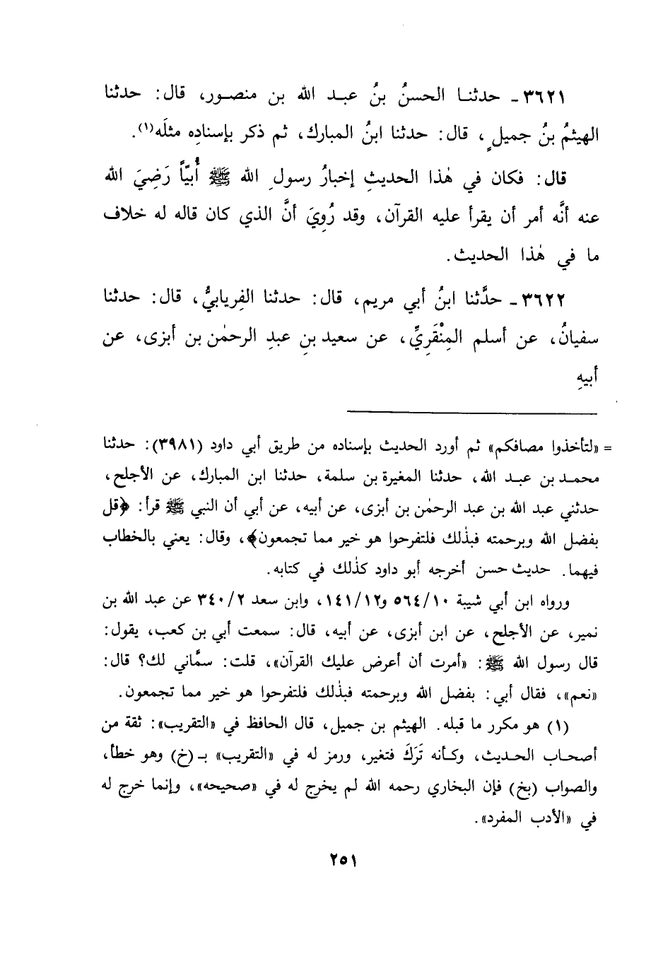 3622 - حَدَّثَنَا ابْنُ أَبِي مَرْيَمَ قَالَ: حَدَّثَنَا الْفِرْيَابِيُّ قَالَ: حَدَّثَنَا سُفْيَانُ , عَنْ أَسْلَمَ الْمِنْقَرِيِّ , عَنْ سَعِيدِ بْنِ عَبْدِ الرَّحْمَنِ بْنِ أَبْزَى , عَنْ أَبِيهِ , -[252]- عَنْ أُبَيِّ بْنِ كَعْبٍ رَضِيَ اللهُ عَنْهُ قَالَ: قَالَ رَسُولُ اللهِ صَلَّى اللَّهُ عَلَيْهِ وَسَلَّمَ: " أُنْزِلَتْ عَلَيَّ سُورَةٌ , وَأُمِرْتُ أَنْ أُقْرِئَكَهَا ". قَالَ: قُلْتُ لَهُ: فَفَرِحْتَ؟ قَالَ: وَمَا يَمْنَعُنِي , وَهُوَ يَقُولُ: (بِفَضْلِ اللهِ وَبِرَحْمَتِهِ فَبِذَلِكَ فَلْتَفْرَحُوا) قَالَ: فَكَانَ فِي هَذَا الْحَدِيثِ أَنَّهُ صَلَّى اللَّهُ عَلَيْهِ وَسَلَّمَ أُمِرَ أَنْ يُقْرِئَهُ سُورَةً مِنَ الْقُرْآنِ أُنْزِلَتْ عَلَيْهِ , وَكَانَ إِسْنَادُ هَذَا الْحَدِيثِ أَحْسَنَ إِسْنَادًا مِنَ الْحَدِيثِ الَّذِي قَبْلَهُ لِجَلَالَةِ أَسْلَمَ الْمِنْقَرِيِّ , وَعُلُوُ قَدْرِهِ فِي الرِّوَايَةِ عَلَى قَدْرِ الْأَجْلَحِ -[253]- فِيهَا , وَلِعُلُوِ سَعِيدِ بْنِ عَبْدِ الرَّحْمَنِ فِي ذَلِكَ عَلَى عَبْدِ اللهِ بْنِ عَبْدِ الرَّحْمَنِ وَشُهْرَتِهِ , وَكَثْرَةِ رِوَايَاتِهِ.