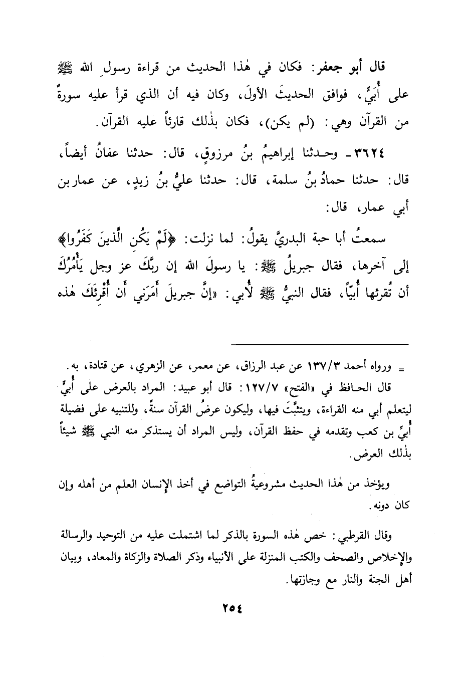3624 - وَحَدَّثَنَا إِبْرَاهِيمُ بْنُ مَرْزُوقٍ قَالَ: حَدَّثَنَا عَفَّانُ , أَيْضًا قَالَ: حَدَّثَنَا حَمَّادُ بْنُ سَلَمَةَ قَالَ: حَدَّثَنَا عَلِيُّ بْنُ زَيْدٍ , عَنْ عَمَّارِ بْنِ أَبِي عَمَّارٍ قَالَ: سَمِعْتُ أَبَا حَبَّةَ الْبَدْرِيَّ يَقُولُ: " لَمَّا نَزَلَتْ: لَمْ يَكُنِ الَّذِينَ كَفَرُوا إِلَى آخِرِهَا , فَقَالَ جِبْرِيلُ صَلَّى اللَّهُ عَلَيْهِ وَسَلَّمَ: " يَا رَسُولَ اللهِ , إِنَّ رَبَّكَ عَزَّ وَجَلَّ يَأْمُرُكَ أَنْ تُقْرِئَهَا أُبَيًّا " , فَقَالَ النَّبِيُّ صَلَّى اللَّهُ عَلَيْهِ وَسَلَّمَ لِأُبَيٍّ: " إِنَّ جِبْرِيلَ أَمَرَنِي أَنْ أُقْرِئَكَ هَذِهِ -[255]- السُّورَةَ " قَالَ أُبَيُّ: وَذُكِرْتُ ثَمَّ يَا رَسُولَ اللهِ؟ قَالَ: " نَعَمْ " , فَبَكَى أُبَيٌّ " قَالَ أَبُو جَعْفَرٍ: فَكَانَ فِي هَذَا الْحَدِيثِ أَنَّ الَّذِي أُمِرَ رَسُولُ اللهِ صَلَّى اللَّهُ عَلَيْهِ وَسَلَّمَ أَنْ يُقْرِئَهُ أُبَيًّا مِنَ الْقُرْآنِ إِنَّمَا هُوَ سُورَةٌ مِنْهُ مِنَ الْقُرْآنِ , وَهَذَا جَائِزٌ فِي اللُّغَةِ , أَنْ يُطْلَقَ عَلَيْهِ اسْمُ الْقُرْآنِ , مَوْجُودٌ فِي كِتَابِ اللهِ , فَمِنْهُ قَوْلُهُ عَزَّ وَجَلَّ: {وَإِذَا قَرَأْتَ الْقُرْآنَ جَعَلْنَا بَيْنَكَ وَبَيْنَ الَّذِينَ لَا يُؤْمِنُونَ بِالْآخِرَةِ حِجَابًا مَسْتُورًا} [الإسراء: 45] , وَقَوْلُهُ: {فَإِذَا قَرَأْتَ الْقُرْآنَ فَاسْتَعِذْ بِاللهِ مِنَ الشَّيْطَانِ الرَّجِيمِ} [النحل: 98] , وَقَوْلُهُ: {وَإِذْ صَرَفْنَا إِلَيْكَ نَفَرًا مِنَ الْجِنِّ يَسْتَمِعُونَ الْقُرْآنَ} [الأحقاف: 29] , وَإِنَّمَا كَانَ ذَلِكَ عَلَى مَا سَمِعُوهُ مِنْهُ , لَا عَلَى كُلِّهِ. وَقَدْ رُوِّينَا عَنِ ابْنِ عَبَّاسٍ فِيمَا تَقَدَّمَ مِنَّا فِي كِتَابِنَا هَذَا , أَنَّ الَّذِي كَانُوا سَمِعُوهُ مِنْهُ هُوَ مَا كَانَ يَقْرَؤُهُ فِي صَلَاةِ الصُّبْحِ , فَإِنْ لَمْ يَكُنْ ذَكَرْنَاهُ , فَسَنَذْكُرُهُ فِيمَا بَعْدُ مِنْ كِتَابِنَا هَذَا إِنْ شَاءَ اللهُ. وَإِنَّمَا حَمَلْنَاهُ عَلَى ذِكْرِ مَا جِئْنَا بِهِ فِي هَذَا الْبَابِ , أَنَّ مُحَمَّدَ بْنَ عَبْدِ اللهِ بْنِ عَبْدِ الْحَكَمِ كَانَ ذَكَرَ لَنَا عَنِ الشَّافِعِيِّ أَنَّهُ قَالَ لَهُ: أَدَلُّ الْأَشْيَاءِ عَلَى أَنْ لَا سُجُودَ فِي الْمُفَصَّلِ مِنَ الْقُرْآنِ حَدِيثُ أُبَيٍّ فِي جَوَابِهِ عَطَاءَ بْنَ يَسَارٍ لَمَّا سَأَلَهُ عَنِ السُّجُودِ فِي الْمُفَصَّلِ فَأَعْلَمَهُ أَنْ لَا سُجُودَ فِيهِ.