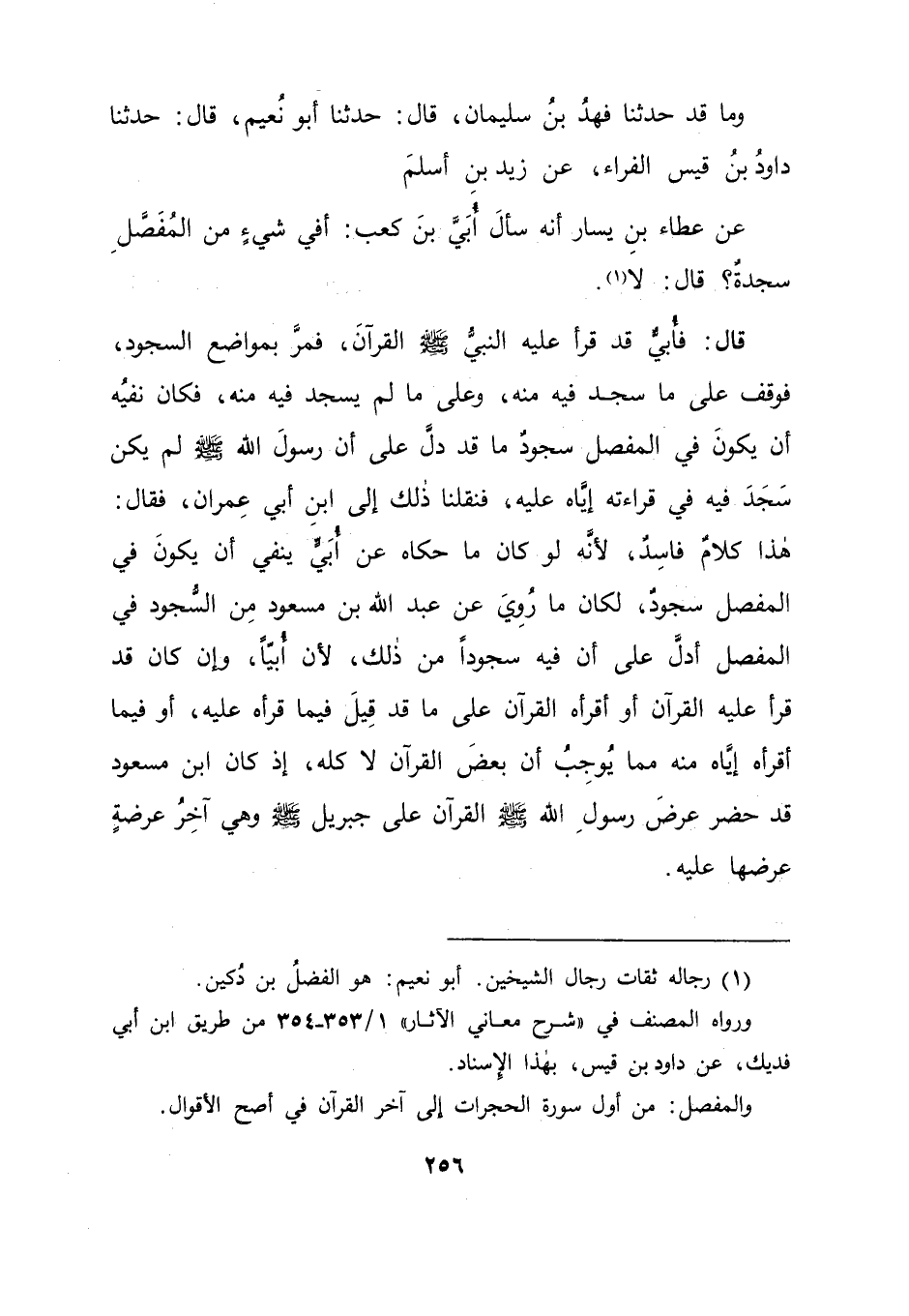 وَمَا قَدْ حَدَّثَنَا فَهْدُ بْنُ سُلَيْمَانَ قَالَ: حَدَّثَنَا أَبُو نُعَيْمٍ قَالَ حَدَّثَنَا دَاوُدُ بْنُ قَيْسٍ الْفَرَّاءُ , عَنْ زَيْدِ بْنِ أَسْلَمَ , عَنْ عَطَاءِ بْنِ يَسَارٍ أَنَّهُ سَأَلَ أُبَيَّ بْنَ كَعْبٍ: " أَفِي شَيْءٍ مِنَ الْمُفَصَّلِ سَجْدَةٌ؟ " قَالَ: " لَا " قَالَ: فَأُبَيُّ قَدْ قَرَأَ عَلَيْهِ النَّبِيُّ صَلَّى اللَّهُ عَلَيْهِ وَسَلَّمَ الْقُرْآنَ , فَمَرَّ بِمَوَاضِعِ السُّجُودِ , فَوَقَفَ عَلَى مَا سَجَدَ فِيهِ مِنْهُ , وَعَلَى مَا لَمْ يَسْجُدْ فِيهِ مِنْهُ , فَكَانَ نَفْيُهُ أَنْ يَكُونَ فِي الْمُفَصَّلِ سُجُودٌ مَا قَدْ دَلَّ عَلَى أَنَّ رَسُولَ اللهِ صَلَّى اللَّهُ عَلَيْهِ وَسَلَّمَ لَمْ يَكُنْ سَجَدَ فِيهِ فِي قِرَاءَتِهِ إِيَّاهُ عَلَيْهِ , فَنَقَلْنَا ذَلِكَ إِلَى ابْنِ أَبِي عِمْرَانَ فَقَالَ: هَذَا كَلَامٌ فَاسِدٌ؛ لِأَنَّهُ لَوْ كَانَ مَا حَكَاهُ عَنْ أُبَيٍّ يَنْفِي أَنْ يَكُونَ فِي الْمُفَصَّلِ سُجُودٌ , لَكَانَ مَا رُوِيَ عَنْ عَبْدِ اللهِ بْنِ مَسْعُودٍ مِنَ السُّجُودِ فِي الْمُفَصَّلِ أَدَلَّ عَلَى أَنَّ فِيهِ سُجُودًا مِنْ ذَلِكَ؛ لِأَنَّ أُبَيًّا , وَإِنْ كَانَ قَدْ قَرَأَ عَلَيْهِ الْقُرْآنَ , أَوْ أَقْرَأَهُ الْقُرْآنَ عَلَى مَا قَدْ قِيلَ فِيمَا قَرَأَهُ عَلَيْهِ , أَوْ فِيمَا أَقْرَأَهُ إِيَّاهُ مِنْهُ مِمَّا يُوجِبُ أَنَّ بَعْضَ الْقُرْآنِ لَا كُلَّهُ , إِذْ كَانَ ابْنُ مَسْعُودٍ قَدْ حَضَرَ عَرْضَ رَسُولِ اللهِ صَلَّى اللَّهُ عَلَيْهِ وَسَلَّمَ الْقُرْآنَ عَلَى جِبْرِيلَ صَلَّى اللَّهُ عَلَيْهِ وَسَلَّمَ , وَهِيَ آخِرُ عَرْضَةٍ عَرَضَهَا عَلَيْهِ