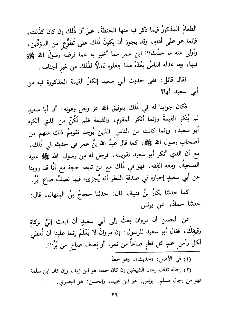 كَمَا حَدَّثَنَا بَكَّارُ بْنُ قُتَيْبَةَ قَالَ: حَدَّثَنَا حَجَّاجُ بْنُ الْمِنْهَالِ قَالَ: حَدَّثَنَا حَمَّادٌ عَنْ يُونُسَ , عَنِ الْحَسَنِ , أَنَّ مَرْوَانَ بَعَثَ إِلَى أَبِي سَعِيدٍ أَنِ ابْعَثْ إِلَيَّ بِزَكَاةِ رَقِيقِكَ , فَقَالَ أَبُو سَعِيدٍ لِلرَّسُولِ: " إِنَّ مَرْوَانَ لَا يَعْلَمُ , إِنَّمَا عَلَيْنَا أَنْ نُعْطِيَ لِكُلِّ رَأْسِ عَبْدٍ كُلَّ فِطْرٍ صَاعًا مِنْ تَمْرٍ أَوْ نِصْفَ صَاعٍ مِنْ بُرٍّ " -[27]- فَدَلَّ مَا رُوِّينَاهُ عَنْ أَبِي سَعِيدٍ فِي هَذَا الْحَدِيثِ عَلَى مَا تَأَوَّلْنَا عَلَيْهِ إِنْكَارَهُ مَا أَنْكَرُهُ فِيمَا تَقَدَّمَ مِنَّا فِي هَذَا الْبَابِ , مَعَ أَنَّا قَدْ وَجَدْنَا فِيمَا رُوِيَ مَرْفُوعًا فِيمَا كَانَ مُؤَدًّى فِي صَدَقَةِ الْفِطْرِ فِي زَمَنِ رَسُولِ اللهِ صَلَّى اللَّهُ عَلَيْهِ وَسَلَّمَ مِنَ الْحِنْطَةِ أَنَّهُ نِصْفُ صَاعٍ.