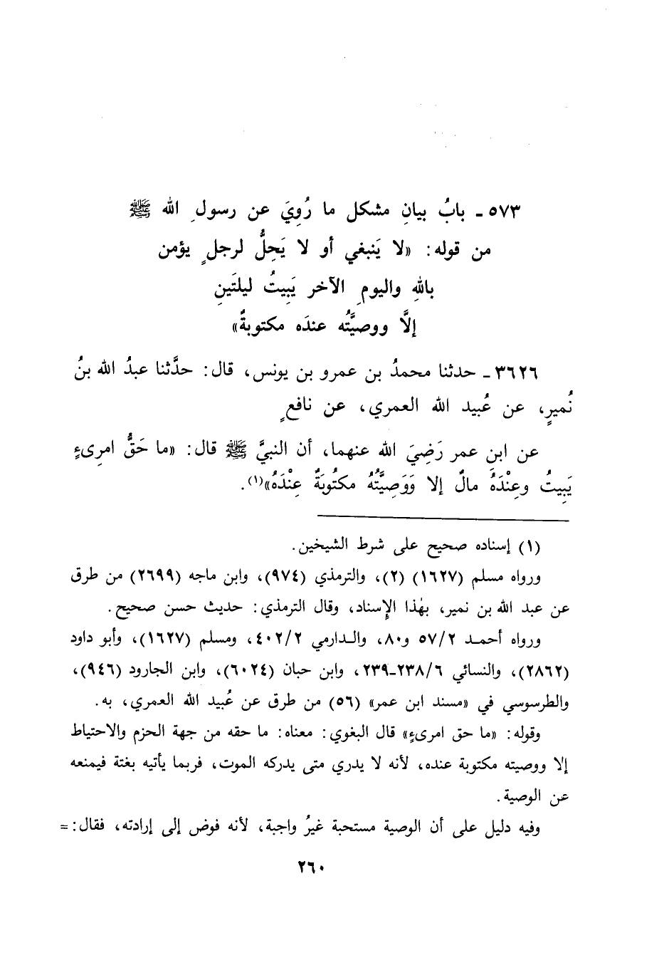 بَابُ بَيَانِ مُشْكِلِ مَا رُوِيَ عَنْ رَسُولِ اللهِ صَلَّى اللَّهُ عَلَيْهِ وَسَلَّمَ مِنْ قَوْلِهِ: " لَا يَنْبَغِي , أَوْ لَا يَحِلُّ لِرَجُلٍ يُؤْمِنُ بِاللهِ وَالْيَوْمِ الْآخِرِ يَبِيتُ لَيْلَتَيْنِ إِلَّا وَوَصِيَّتُهُ عِنْدَهُ مَكْتُوبَةٌ "