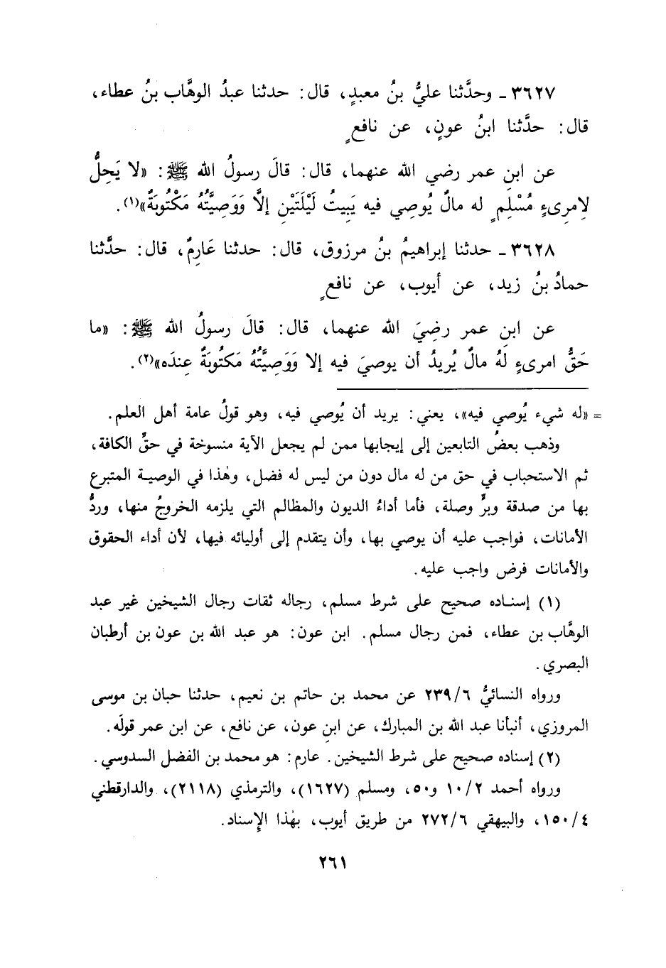 3627 - وَحَدَّثَنَا عَلِيُّ بْنُ مَعْبَدٍ قَالَ: حَدَّثَنَا عَبْدُ الْوَهَّابِ بْنُ عَطَاءٍ قَالَ: حَدَّثَنَا ابْنُ عَوْنٍ , عَنْ نَافِعٍ , عَنِ ابْنِ عُمَرَ رَضِيَ اللهُ عَنْهُمَا قَالَ: قَالَ رَسُولُ اللهِ صَلَّى اللَّهُ عَلَيْهِ وَسَلَّمَ: " لَا يَحِلُّ لِامْرِئٍ مُسْلِمٍ لَهُ مَالٌ يُوصِي فِيهِ يَبِيتُ لَيْلَتَيْنِ إِلَّا وَوَصِيَّتُهُ مَكْتُوبَةٌ "