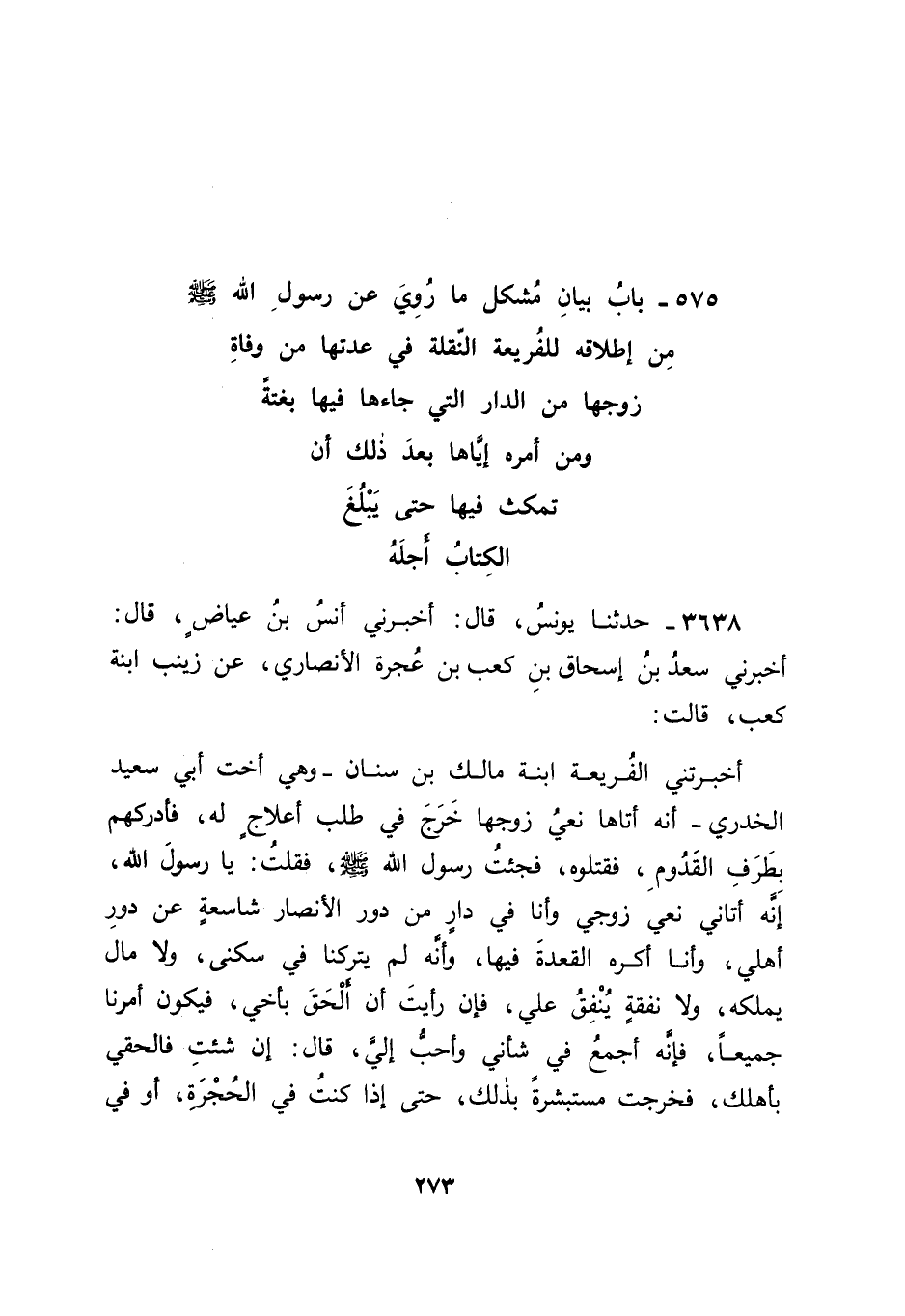 3638 - حَدَّثَنَا يُونُسُ قَالَ: أَخْبَرَنِي أَنَسُ بْنُ عِيَاضٍ قَالَ: أَخْبَرَنِي سَعْدُ بْنُ إِسْحَاقَ بْنِ كَعْبِ بْنِ عُجْرَةَ الْأَنْصَارِيُّ , عَنْ زَيْنَبَ ابْنَةِ كَعْبٍ قَالَتْ: أَخْبَرَتْنِي الْفُرَيْعَةُ ابْنَةُ مَالِكِ بْنِ سِنَانٍ , وَهِيَ أُخْتُ أَبِي سَعِيدٍ الْخُدْرِيِّ: " أَنَّهُ أَتَاهَا نَعْيُ زَوْجِهَا , خَرَجَ فِي طَلَبِ أَعْلَاجٍ لَهُ فَأَدْرَكَهُمْ بِطَرَفِ الْقَدُومِ , فَقَتَلُوهُ , فَجِئْتُ رَسُولَ اللهِ صَلَّى اللَّهُ عَلَيْهِ وَسَلَّمَ , فَقُلْتُ: يَا رَسُولَ اللهِ , إِنَّهُ أَتَانِي نَعْيُ زَوْجِي , وَأَنَا فِي دَارٍ مِنْ دُورِ الْأَنْصَارِ شَاسِعَةٍ عَنْ دُورِ أَهْلِي , وَأَنَا أَكْرَهُ الْقَعْدَةَ فِيهَا , وَأَنَّهُ لَمْ يَتْرُكْنَا فِي سُكْنَى , وَلَا مَالٍ يَمْلِكُهُ , وَلَا نَفَقَةٍ يُنْفِقُ عَلَيَّ , فَإِنْ رَأَيْتَ أَنْ أَلْحَقَ بِأَخِي , فَيَكُونَ أَمْرُنَا جَمِيعًا , فَإِنَّهُ أَجْمَعُ فِي شَأْنِي , وَأَحَبُّ إِلَيَّ. قَالَ: " إِنْ شِئْتِ فَالْحَقِي بِأَهْلِكِ " , فَخَرَجْتُ مُسْتَبْشِرَةً بِذَلِكَ , حَتَّى إِذَا كُنْتُ فِي الْحُجْرَةِ , أَوْ فِي -[274]- الْمَسْجِدِ دَعَانِي , أَوْ دُعِيتُ لَهُ فَقَالَ: " كَيْفَ زَعَمْتِ؟ " فَرَدَدْتُ عَلَيْهِ الْحَدِيثَ مِنْ أَوَّلِهِ فَقَالَ: " امْكُثِي فِي الْبَيْتِ الَّذِي جَاءَكِ فِيهِ نَعْيُ زَوْجِكِ , حَتَّى يَبْلُغَ الْكِتَابُ أَجَلَهُ " فَاعْتَدَّتْ فِيهِ أَرْبَعَةَ أَشْهُرٍ وَعَشْرًا , فَأَرْسَلَ إِلَيْهَا عُثْمَانُ رَضِيَ اللهُ عَنْهُ , فَسَأَلَهَا , فَأَخْبَرَتْهُ , فَقَضَى بِهِ " قَالَ أَبُو جَعْفَرٍ: وَهَذَا حَدِيثٌ جَلِيلُ الْمِقْدَارِ يَدُورُ عَلَى سَعْدِ بْنِ إِسْحَاقَ الَّذِي حَدَّثَ بِهِ عَنْهُ أَنَسٍ , وَقَدْ رَوَاهُ غَيْرُ وَاحِدٍ مِنْ جُلَّةِ أَهْلِ الْعِلْمِ مِمَّنْ يَتَجَاوَزُهُ فِي السِّنِّ عَنْهُ , مِمَّنْ رَوَاهُ عَنْهُ , مِمَّنْ هُوَ كَذَلِكَ ابْنُ شِهَابٍ الزُّهْرِيُّ. -[275]-
