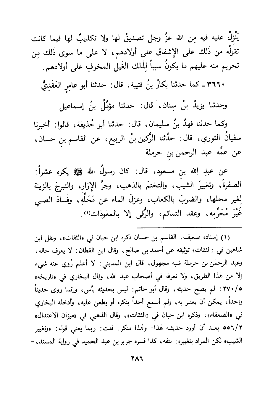 3660 - كَمَا حَدَّثَنَا بَكَّارُ بْنُ قُتَيْبَةَ قَالَ: حَدَّثَنَا أَبُو عَامِرٍ الْعَقَدِيُّ , وَحَدَّثَنَا يَزِيدُ بْنُ سِنَانٍ قَالَ: حَدَّثَنَا مُؤَمَّلُ بْنُ إِسْمَاعِيلَ , وَكَمَا حَدَّثَنَا فَهْدُ بْنُ سُلَيْمَانَ قَالَ: حَدَّثَنَا أَبُو حُذَيْفَةَ , قَالُوا: أَخْبَرَنَا سُفْيَانُ الثَّوْرِيُّ قَالَ: حَدَّثَنَا الرُّكَيْنُ بْنُ الرَّبِيعِ , عَنِ الْقَاسِمِ بْنِ حَسَّانَ , عَنْ عَمِّهِ عَبْدِ الرَّحْمَنِ بْنِ حَرْمَلَةَ , عَنْ عَبْدِ اللهِ بْنِ مَسْعُودٍ قَالَ: " كَانَ رَسُولُ اللهِ صَلَّى اللَّهُ عَلَيْهِ وَسَلَّمَ يَكْرَهُ عَشْرًا: الصُّفْرَةَ , وَتَغْيِيرَ الشَّيْبِ , وَالتَّخَتُّمَ بِالذَّهَبِ , وَجَرَّ الْإِزَارِ , وَالتَّبَرُّجَ بِالزِّينَةِ لِغَيْرِ مَحَلِّهَا , وَالضَّرْبَ بِالْكِعَابِ , وَعَزْلَ الْمَاءِ عَنْ مَحَلِّهِ , وَفَسَادَ الصَّبِيِّ غَيْرَ مُحَرِّمِهِ , وَعَقْدَ التَّمَائِمِ , وَالرُّقَى إِلَّا بِالْمُعَوِّذَاتِ " -[287]-