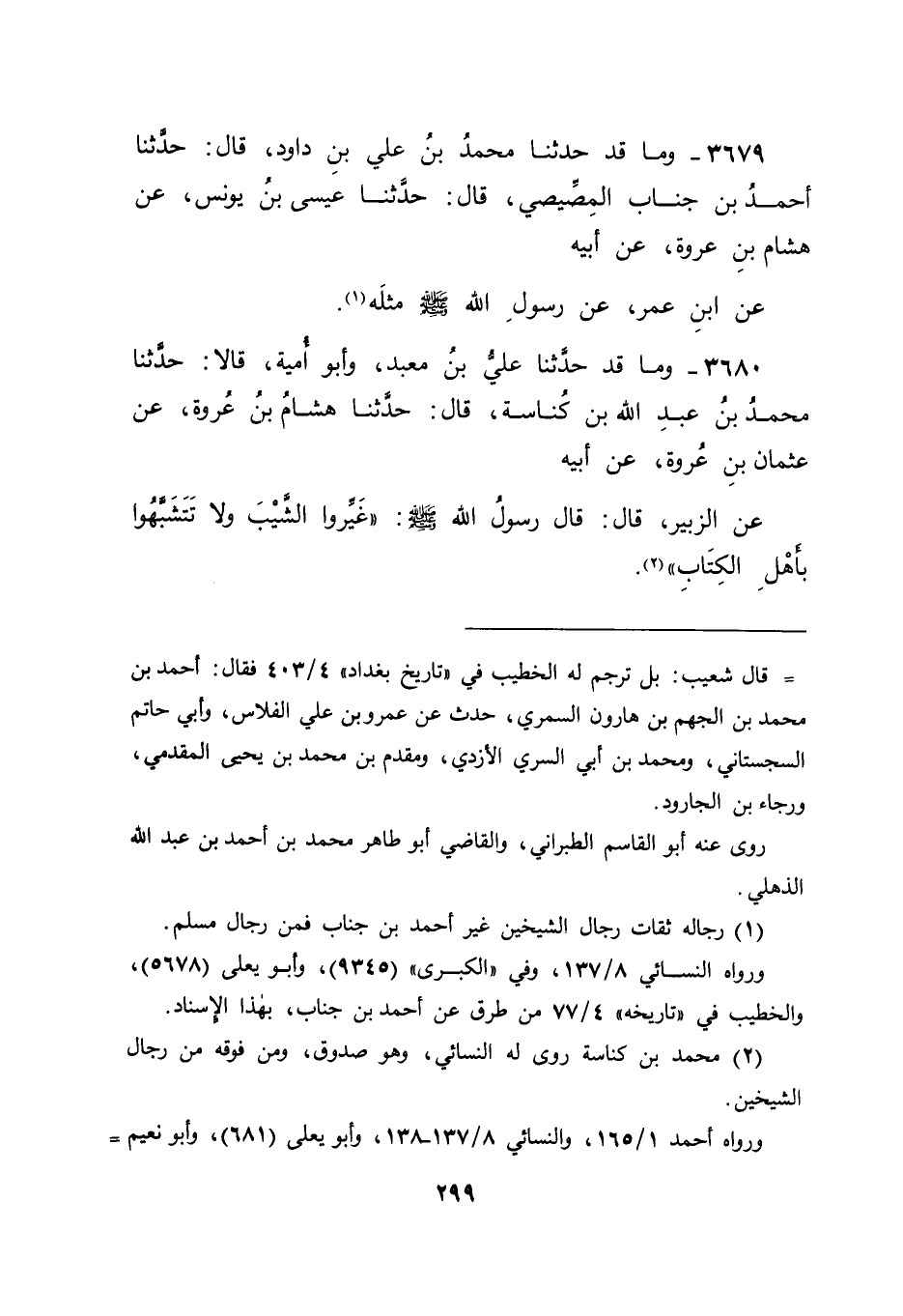 3680 - وَمَا قَدْ حَدَّثَنَا عَلِيُّ بْنُ مَعْبَدٍ وَأَبُو أُمَيَّةَ قَالَا: حَدَّثَنَا مُحَمَّدُ بْنُ عَبْدِ اللهِ بْنِ كُنَاسَةَ قَالَ: حَدَّثَنَا هِشَامُ بْنُ عُرْوَةَ , عَنْ عُثْمَانَ بْنِ عُرْوَةَ , عَنْ أَبِيهِ , عَنِ الزُّبَيْرِ قَالَ: قَالَ رَسُولُ اللهِ صَلَّى اللَّهُ عَلَيْهِ وَسَلَّمَ: " غَيِّرُوا الشَّيْبَ , وَلَا تَتَشَبَّهُوا بِأَهْلِ الْكِتَابِ " -[300]- قَالَ أَبُو جَعْفَرٍ: فَاضْطَرَبَ عَلَيْنَا حَدِيثُ عُرْوَةَ هَذَا فِي إِسْنَادِهِ , فَرَوَاهُ أَبُو مُعَاوِيَةَ , عَنْ هِشَامٍ , عَنْ أَبِيهِ , عَنْ عَائِشَةَ. وَرَوَاهُ عِيسَى بْنُ يُونُسَ , عَنْ هِشَامٍ , عَنْ أَبِيهِ , عَنِ ابْنِ عُمَرَ , وَرَوَاهُ ابْنُ كُنَاسَةَ , عَنْ هِشَامٍ , عَنْ أَخِيهِ عُثْمَانَ , عَنْ أَبِيهِ , عَنِ الزُّبَيْرِ , وَهَذَا اضْطِرَابٌ شَدِيدٌ , ثُمَّ رَجَعْنَا إِلَى مَا رُوِيَ عَنْ غَيْرِهِ فِيهِ عَنِ النَّبِيِّ صَلَّى اللَّهُ عَلَيْهِ وَسَلَّمَ.