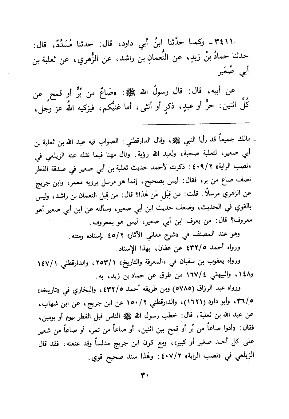 3411 - وَكَمَا حَدَّثَنَا ابْنُ أَبِي دَاوُدَ , قَالَ: حَدَّثَنَا مُسَدَّدٌ , قَالَ: حَدَّثَنَا حَمَّادُ بْنُ زَيْدٍ , عَنِ النُّعْمَانِ بْنِ رَاشِدٍ , عَنِ الزُّهْرِيِّ , عَنْ ثَعْلَبَةَ بْنِ أَبِي صُعَيْرٍ , عَنْ أَبِيهِ , قَالَ: قَالَ رَسُولُ اللهِ صَلَّى اللَّهُ عَلَيْهِ وَسَلَّمَ: " صَاعٌ مِنْ بُرٍّ أَوْ قَمْحٍ عَنْ كُلِّ اثْنَيْنِ , حُرٍّ أَوْ عَبْدٍ , ذَكَرٍ أَوْ أُنْثَى , أَمَّا غَنِيُّكُمْ فَيُزَكِّيهِ اللهُ عَزَّ وَجَلَّ , -[31]- وَأَمَّا فَقِيرُكُمْ فَيُرَدُّ عَلَيْهِ مِثْلُ مَا أَعْطَى " فَفِيمَا رُوِّينَاهُ فِي هَذَا الْفَصْلِ عَنْ أَسْمَاءَ ذِكْرُ مَا يُؤَدُّونَهُ فِي زَكَاةِ الْفِطْرِ مِنَ الْقَمْحِ عَلَى عَهْدِ رَسُولِ اللهِ صَلَّى اللَّهُ عَلَيْهِ وَسَلَّمَ أَنَّهُ كَانَ نِصْفَ صَاعٍ , وَفِي حَدِيثِ ثَعْلَبَةَ بْنِ أَبِي صُعَيْرٍ أَمَرَ النَّبِيُّ صَلَّى اللَّهُ عَلَيْهِ وَسَلَّمَ بِأَدَاءِ ذَلِكَ الْمِقْدَارِ مِنَ الْبُرِّ , فَفِي ذَلِكَ: مَا قَدْ وَكَّدَ أَمْرَ النِّصْفِ الصَّاعِ مِنَ الْبُرِّ. وَدَلَّ أَنَّ مَا زَادَ عَلَيْهِ مِمَّا كَانُوا يُخْرِجُونَهُ مِنَ الْبُرِّ حِينَئِذٍ كَانَ عَلَى التَّبَرُّعِ مِنْهُمْ وَالزِّيَادَةِ فِي الْخَيْرِ , لَا عَلَى الْفَرْضِ. فَقَالَ قَائِلٌ: فَقَدْ رَوَى هَذَا الْحَدِيثَ بَكْرُ بْنُ وَائِلٍ الْكُوفِيُّ , عَنِ الزُّهْرِيِّ فَخَالَفَ فِيهِ النُّعْمَانُ , عَنِ الزُّهْرِيِّ.