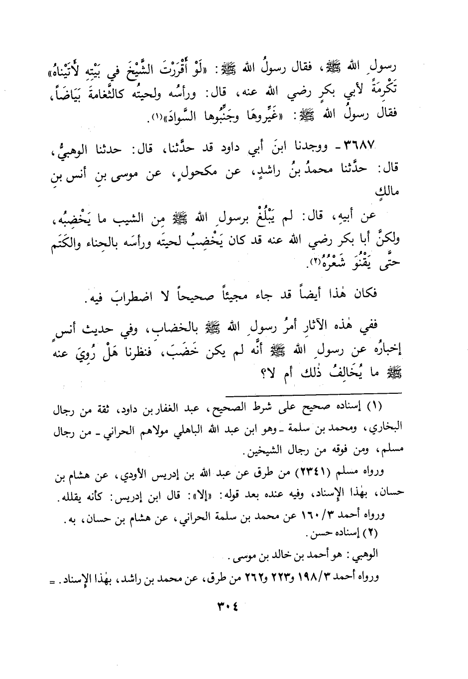 3687 - وَوَجَدْنَا ابْنَ أَبِي دَاوُدَ قَدْ حَدَّثَنَا قَالَ: حَدَّثَنَا الْوَهْبِيُّ قَالَ: حَدَّثَنَا مُحَمَّدُ بْنُ رَاشِدٍ , عَنْ مَكْحُولٍ , عَنْ مُوسَى بْنِ أَنَسِ بْنِ مَالِكٍ , عَنْ أَبِيهِ قَالَ: " لَمْ يَبْلُغْ بِرَسُولِ اللهِ صَلَّى اللَّهُ عَلَيْهِ وَسَلَّمَ مِنَ الشَّيْبِ مَا يَخْضِبُهُ , وَلَكِنَّ أَبَا بَكْرٍ رَضِيَ اللهُ عَنْهُ قَدْ كَانَ يَخْضِبُ لِحْيَتَهُ وَرَأْسَهُ بِالْحِنَّاءِ وَالْكَتَمِ , حَتَّى يَقْنُوَ شَعْرُهُ " فَكَانَ هَذَا أَيْضًا قَدْ جَاءَ مَجِيئًا صَحِيحًا لَا اضْطِرَابَ فِيهِ. فَفِي هَذِهِ الْآثَارِ أَمْرُ رَسُولِ اللهِ صَلَّى اللَّهُ عَلَيْهِ وَسَلَّمَ بِالْخِضَابِ , وَفِي حَدِيثِ أَنَسٍ إِخْبَارُهُ عَنْ رَسُولِ اللهِ صَلَّى اللَّهُ عَلَيْهِ وَسَلَّمَ , أَنَّهُ لَمْ يَكُنْ يَخْضِبُ , فَنَظَرْنَا هَلْ رُوِيَ عَنْهُ صَلَّى اللَّهُ عَلَيْهِ وَسَلَّمَ مَا يُخَالِفُ ذَلِكَ , أَمْ لَا؟