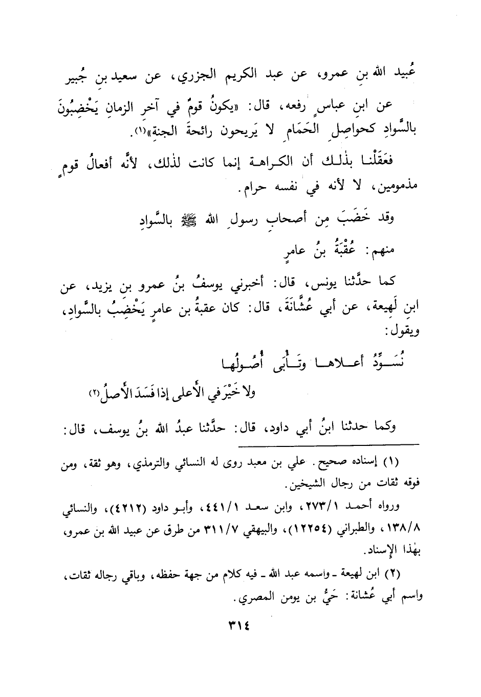 " وَكَمَا حَدَّثَنَا ابْنُ أَبِي دَاوُدَ قَالَ: حَدَّثَنَا عَبْدُ اللهِ بْنُ يُوسُفَ قَالَ: -[315]- قُلْتُ لِابْنِ لَهِيعَةَ , أَحَدَّثَكُمْ أَبُو عُشَانَةَ , ثُمَّ ذَكَرَ هَذَا الْحَدِيثَ , فَقَالَ: لَمْ أَسْمَعْهُ مِنْ أَبِي عُشَانَةَ , وَلَكِنْ حَدَّثَنِيهِ اللَّيْثُ بْنُ سَعْدٍ , عَنْ أَبِي عُشَانَةَ قَالَ أَبُو جَعْفَرٍ: قَالَ لَنَا ابْنُ أَبِي دَاوُدَ: لَمْ يَسْمَعِ اللَّيْثُ بْنُ سَعْدٍ مِنْ أَبِي عُشَانَةَ غَيْرَ هَذَا الْحَدِيثِ , وَلَمْ يَسْمَعِ ابْنُ لَهِيعَةَ مِنَ اللَّيْثِ غَيْرَ هَذَا الْحَدِيثِ. وَقَدْ رُوِيَ عَنِ الْحُسَيْنِ بْنِ عَلِيٍّ رَضِيَ اللهُ عَنْهُ أَيْضًا أَنَّهُ كَانَ يَخْضِبُ بِالسَّوَادِ.