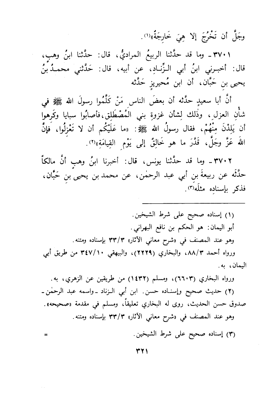 3701 - وَمَا قَدْ حَدَّثَنَا الرَّبِيعُ الْمُرَادِيُّ قَالَ: حَدَّثَنَا ابْنُ وَهْبٍ قَالَ: أَخْبَرَنِي ابْنُ أَبِي الزِّنَادِ , عَنْ أَبِيهِ قَالَ: حَدَّثَنِي مُحَمَّدُ بْنُ يَحْيَى بْنِ حَبَّانَ , أَنَّ ابْنَ مُحَيْرِيزٍ , حَدَّثَهُ , أَنَّ أَبَا سَعِيدٍ حَدَّثَهُ أَنَّ بَعْضَ النَّاسِ كَلَّمُوا رَسُولَ اللهِ صَلَّى اللَّهُ عَلَيْهِ وَسَلَّمَ فِي شَأْنِ الْعَزْلِ , وَذَلِكَ لِشَأْنِ غَزْوَةِ بَنِي الْمُصْطَلِقِ , فَأَصَابُوا سَبَايَا وَكَرِهُوا أَنْ يَلِدْنَ مِنْهُمْ , فَقَالَ رَسُولُ اللهِ صَلَّى اللَّهُ عَلَيْهِ وَسَلَّمَ: " مَا عَلَيْكُمْ أَنْ لَا تَعْزِلُوا , فَإِنَّ اللهَ عَزَّ وَجَلَّ قَدَّرَ مَا هُوَ خَالِقٌ إِلَى يَوْمِ الْقِيَامَةِ "