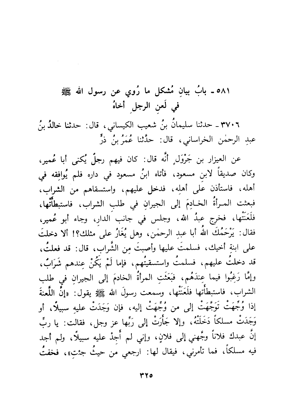 3706 - حَدَّثَنَا سُلَيْمَانُ بْنُ شُعَيْبٍ الْكَيْسَانِيُّ قَالَ: حَدَّثَنَا خَالِدُ بْنُ عَبْدِ الرَّحْمَنِ الْخُرَاسَانِيُّ قَالَ: حَدَّثَنَا عُمَرُ بْنُ ذَرٍّ , عَنِ الْعَيْزَارِ بْنِ جَرْوَلٍ , أَنَّهُ قَالَ: كَانَ فِيهِمْ رَجُلٌ يُكْنَى أَبَا عُمَيْرٍ , وَكَانَ صَدِيقًا لِابْنِ مَسْعُودٍ , فَأَتَاهُ ابْنُ مَسْعُودٍ فِي دَارِهِ فَلَمْ يُوَافِقْهُ فِي أَهْلِهِ , فَاسْتَأْذَنَ عَلَى أَهْلِهِ , فَدَخَلَ عَلَيْهِمْ , وَاسْتَسْقَاهُمْ مِنَ الشَّرَابِ , فَبَعَثَتِ الْمَرْأَةُ الْخَادِمَ إِلَى الْجِيرَانِ فِي طَلَبِ الشَّرَابِ , فَاسْتَبْطَأَتْهَا فَلَعَنَتْهَا , فَخَرَجَ عَبْدُ اللهِ وَجَلَسَ فِي جَانِبِ الدَّارِ , وَجَاءَ أَبُو عُمَيْرٍ فَقَالَ: " يَرْحَمُكَ اللهُ أَبَا عَبْدِ الرَّحْمَنِ , وَهَلْ يُغَارُ عَلَى مِثْلِكَ؟ أَلَا دَخَلْتَ عَلَى ابْنَةِ أَخِيكَ فَسَلَّمْتَ عَلَيْهَا , وَأَصَبْتَ مِنَ الشَّرَابِ؟ قَالَ: قَدْ فَعَلْتُ , قَدْ دَخَلْتُ عَلَيْهِمْ , فَسَلَّمْتُ وَاسْتَسْقَيْتُهُمْ , فَإِمَّا لَمْ يَكُنْ عِنْدَهُمْ شَرَابٌ , وَإِمَّا رَغِبُوا فِيمَا عِنْدَهُمْ , فَبَعَثَتِ الْمَرْأَةُ الْخَادِمَ إِلَى الْجِيرَانِ فِي طَلَبِ الشَّرَابِ , فَاسْتَبْطَأَتْهَا فَلَعَنَتْهَا , وَسَمِعْتُ رَسُولَ اللهِ صَلَّى اللَّهُ عَلَيْهِ وَسَلَّمَ يَقُولُ: " إِنَّ اللَّعْنَةَ إِذَا وُجِّهَتْ تَوَجَّهَتْ إِلَى مَنْ وُجِّهَتْ إِلَيْهِ , فَإِنْ وَجَدَتْ عَلَيْهِ سَبِيلًا , أَوْ وَجَدَتْ مَسْلَكًا دَخَلَتْهُ , وَإِلَّا جَأَرَتْ إِلَى رَبِّهَا عَزَّ وَجَلَّ فَقَالَتْ: يَا رَبِّ , إِنَّ عَبْدَكَ فُلَانًا وَجَّهَنِي إِلَى فُلَانٍ , وَإِنِّي لَمْ أَجِدْ عَلَيْهِ سَبِيلًا , وَلَمْ أَجِدْ فِيهِ مَسْلَكًا , فَمَا تَأْمُرُنِي؟ فَيُقَالُ لَهَا: ارْجِعِي مِنْ حَيْثُ جِئْتِ " , فَخِفْتُ -[326]- أَنْ تَكُونَ الْخَادِمُ مَعْذُورَةً , فَتَرْجِعَ اللَّعْنَةُ فَأَكُونُ سَبِيلَهَا , فَذَلِكَ الَّذِي أَخْرَجَنِي " وَلَمْ يَذْكُرْ لَنَا الْكَيْسَانِيُّ فِي حَدِيثِهِ هَذَا بَيْنَ ابْنِ مَسْعُودٍ وَبَيْنَ الْعَيْزَارِ أَحَدًا , وَالْعَيْزَارُ فَرَجُلٌ قَدِيمٌ , فَاحْتُمِلَ أَنْ يَكُونَ حَدَّثَ بِهَذَا الْحَدِيثِ لِأَخْذِهِ إِيَّاهُ عَنْ عَبْدِ اللهِ بْنِ مَسْعُودٍ , وَاحْتُمِلَ أَنْ يَكُونَ بَيْنَهُ وَبَيْنَهُ فِيهِ غَيْرُهُ مِمَّنْ حَدَّثَهُ بِهِ عَنْهُ , فَنَظَرْنَا فِي ذَلِكَ.