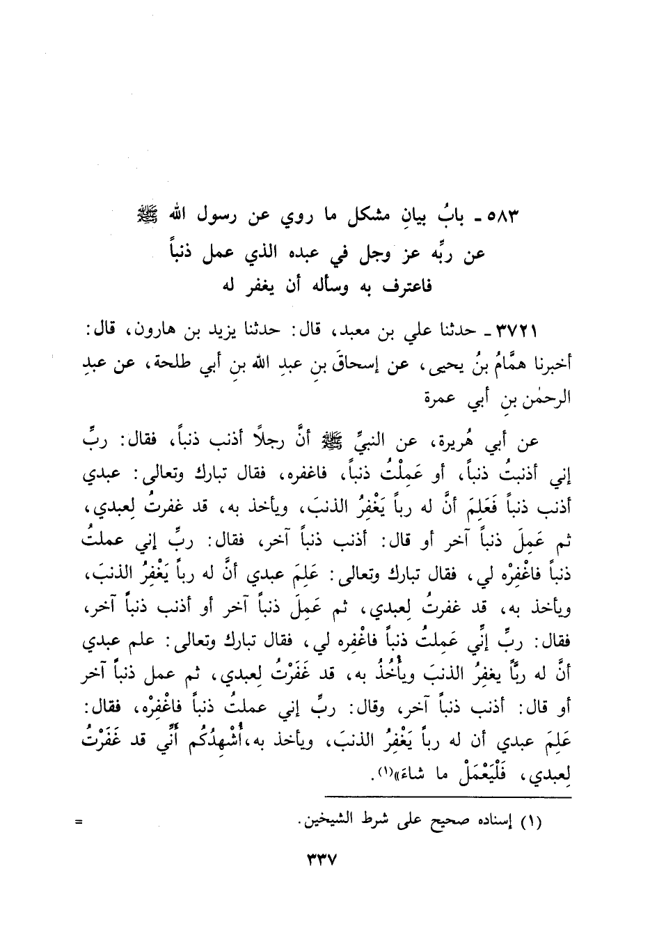 3721 - حَدَّثَنَا عَلِيُّ بْنُ مَعْبَدٍ قَالَ: حَدَّثَنَا يَزِيدُ بْنُ هَارُونَ قَالَ: أَخْبَرَنَا هَمَّامُ بْنُ يَحْيَى , عَنْ إِسْحَاقَ بْنِ عَبْدِ اللهِ بْنِ أَبِي طَلْحَةَ , عَنْ عَبْدِ الرَّحْمَنِ بْنِ أَبِي عَمْرَةَ , عَنْ أَبِي هُرَيْرَةَ , عَنِ النَّبِيِّ صَلَّى اللَّهُ عَلَيْهِ وَسَلَّمَ: " أَنَّ رَجُلًا أَذْنَبَ ذَنْبًا فَقَالَ: رَبِّ إِنِّي أَذْنَبْتُ ذَنْبًا - أَوْ عَمِلْتُ ذَنْبًا - فَاغْفِرْهُ , فَقَالَ تَبَارَكَ وَتَعَالَى: عَبْدِي أَذْنَبَ ذَنْبًا , فَعَلِمَ أَنَّ لَهُ رَبًّا يَغْفِرُ الذَّنْبَ , وَيَأْخُذُ بِهِ , قَدْ غَفَرْتُ لِعَبْدِي , ثُمَّ عَمِلَ ذَنْبًا آخَرَ , أَوْ قَالَ: أَذْنَبَ ذَنْبًا آخَرَ , فَقَالَ: رَبِّ إِنِّي عَمِلْتُ ذَنْبًا , فَاغْفِرْهُ لِي , فَقَالَ تَبَارَكَ وَتَعَالَى: عَلِمَ عَبْدِي أَنَّ لَهُ رَبًّا يَغْفِرُ الذَّنْبَ , وَيَأْخُذُ بِهِ , قَدْ غَفَرْتُ لِعَبْدِي. ثُمَّ عَمِلَ ذَنْبًا آخَرَ , أَوْ أَذْنَبَ ذَنْبًا آخَرَ فَقَالَ: رَبِّ إِنِّي عَمِلْتُ ذَنْبًا , فَاغْفِرْهُ لِي , فَقَالَ تَبَارَكَ وَتَعَالَى: عَلِمَ عَبْدِي أَنَّ لَهُ رَبًّا يَغْفِرُ الذَّنْبَ , وَيَأْخُذُ بِهِ , قَدْ غَفَرْتُ لِعَبْدِي. ثُمَّ عَمِلَ ذَنْبًا آخَرَ , أَوْ قَالَ: أَذْنَبَ ذَنْبًا آخَرَ وَقَالَ: رَبِّ إِنِّي عَمِلْتُ ذَنْبًا , فَاغْفِرْهُ , فَقَالَ: عَلِمَ عَبْدِي , أَنَّ لَهُ رَبًّا يَغْفِرُ الذَّنْبَ , وَيَأْخُذُ بِهِ , أُشْهِدُكُمْ أَنِّي قَدْ غَفَرْتُ لِعَبْدِي , فَلْيَعْمَلْ مَا شَاءَ " -[338]- فَتَأَمَّلْنَا هَذَا الْحَدِيثَ , فَكَانَ أَحْسَنَ مَا وَقَفْنَا عَلَيْهِ مِمَّا احْتَمَلَهُ - وَاللهُ أَعْلَمُ - أَنَّ الْعَبْدَ بِمَا يَكُونُ مِنْهُ الذُّنُوبُ أَنَّهُ ذَنْبٌ , وَأَنَّ اللهَ عَزَّ وَجَلَّ قَدْ عَلِمَهُ مِنْهُ , وَأَنَّهُ يَأْخُذُهُ بِالْعُقُوبَةِ عَلَيْهِ إِنْ شَاءَ , وَيَعْفُو لَهُ إِنْ شَاءَ إِيمَانًا مِنْهُ بِهِ , وَمَعْقُولٌ أَنَّهُ إِذَا كَانَ خَائِفًا مِنْ عُقُوبَتِهِ جَلَّ وَعَزَّ لِذَلِكَ الذَّنْبِ , وَرَاجِيًا لِمَغْفِرَتِهِ لَهُ عَلَيْهِ , أَنَّهُ مِمَّنْ قَدْ سَرَّتْهُ حَسَنَتُهُ , وَسَاءَتْهُ سَيِّئَتُهُ , فَدَخَلَ بِذَلِكَ فِي الْمَعْنَى الَّذِي فِي الْحَدِيثِ الَّذِي ذَكَرْنَاهُ فِي الْبَابِ الَّذِي قَبْلَ هَذَا الْبَابِ , وَاسْتَحَقَّ بِهِ الْإِيمَانَ , وَكَانَ يَعْلَمُهُ أَنَّ اللهَ عَزَّ وَجَلَّ قَدْ عَلِمَ مَا كَانَ مِنْهُ بِخِلَافِ غَيْرِهِ مِمَّنْ يَظُنُّ أَنَّ اللهَ عَزَّ وَجَلَّ يَخْفَى عَلَيْهِ مَا يَكُونُ مِنْهُ مِمَّنْ يَسْتَحِقُّ بِذَلِكَ الْكُفْرَ , وَهُوَ مِمَّنْ قَدْ ذَكَرَهُ اللهُ عَزَّ وَجَلَّ فِي كِتَابِهِ بِقَوْلِهِ: {وَمَا كُنْتُمْ تَسْتَتِرُونَ أَنْ يَشْهَدَ عَلَيْكُمْ سَمْعُكُمْ وَلَا أَبْصَارُكُمْ وَلَا جُلُودُكُمْ وَلَكِنْ ظَنَنْتُمْ أَنَّ اللهَ لَا يَعْلَمُ كَثِيرًا مِمَّا تَعْمَلُونَ} [فصلت: 22] , ثُمَّ أَتْبَعَ ذَلِكَ عَزَّ وَجَلَّ بِقَوْلِهِ: {وَذَلِكُمْ ظَنُّكُمُ الَّذِي ظَنَنْتُمْ بِرَبِّكُمْ أَرْدَاكُمْ فَأَصْبَحْتُمْ مِنَ الْخَاسِرِينَ} [فصلت: 23] , فَكَانَ الرَّجُلُ الَّذِي -[339]- ذَكَرْنَاهُ فِي حَدِيثِ أَبِي هُرَيْرَةَ الَّذِي رُوِّينَاهُ فِي صَدْرِ هَذَا الْبَابِ ضِدًّا لِمَنْ هَذِهِ صِفَتُهُ , فَكَانَ مَنْ دَخَلَ فِي هَذِهِ الْآيَةِ كَافِرًا , فَاسْتَحَقَّ النَّارَ , وَمَنْ دَخَلَ فِي ذَلِكَ الْحَدِيثِ مُؤْمِنًا , فَاسْتَحَقَّ مِنْ رَبِّهِ عَزَّ وَجَلَّ بِفَضْلِهِ عَلَيْهِ بِمَا ذَكَرَ بِفَضْلِهِ بِهِ عَلَيْهِ فِي ذَلِكَ الْحَدِيثِ , وَاللهَ عَزَّ وَجَلَّ نَسْأَلُهُ التَّوْفِيقَ.